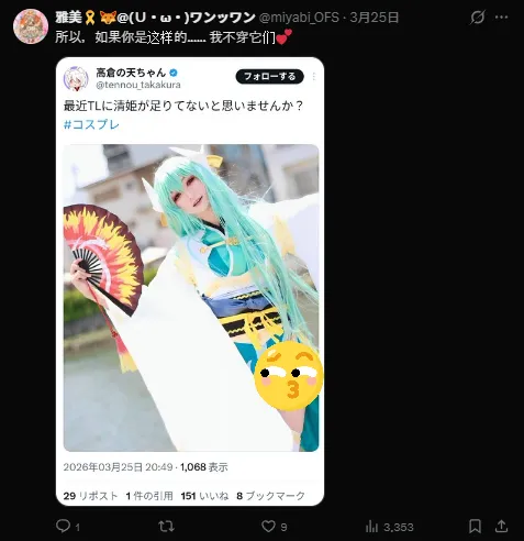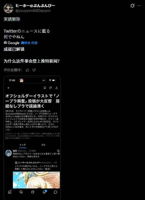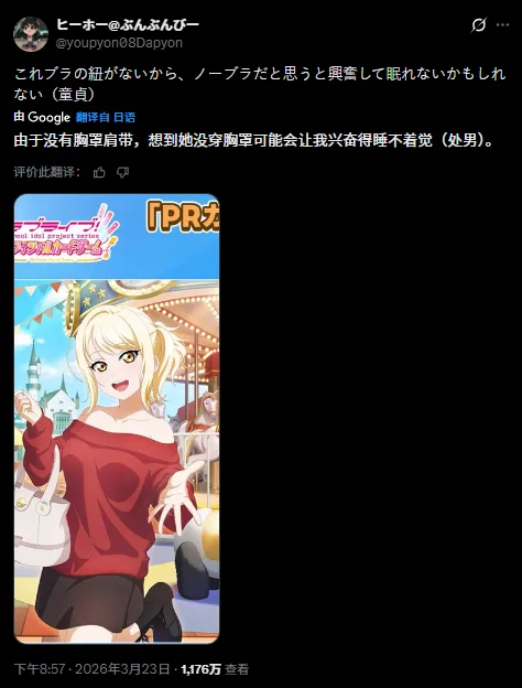 这位ID为「ヒーホー」的日本网友,在看到插画后,直接在社交平台发了一条让所有人瞳孔地震的动态:“没看到胸罩的肩带,一想到她可能没穿胸罩,就让我兴奋得睡不着觉了(处男)”。