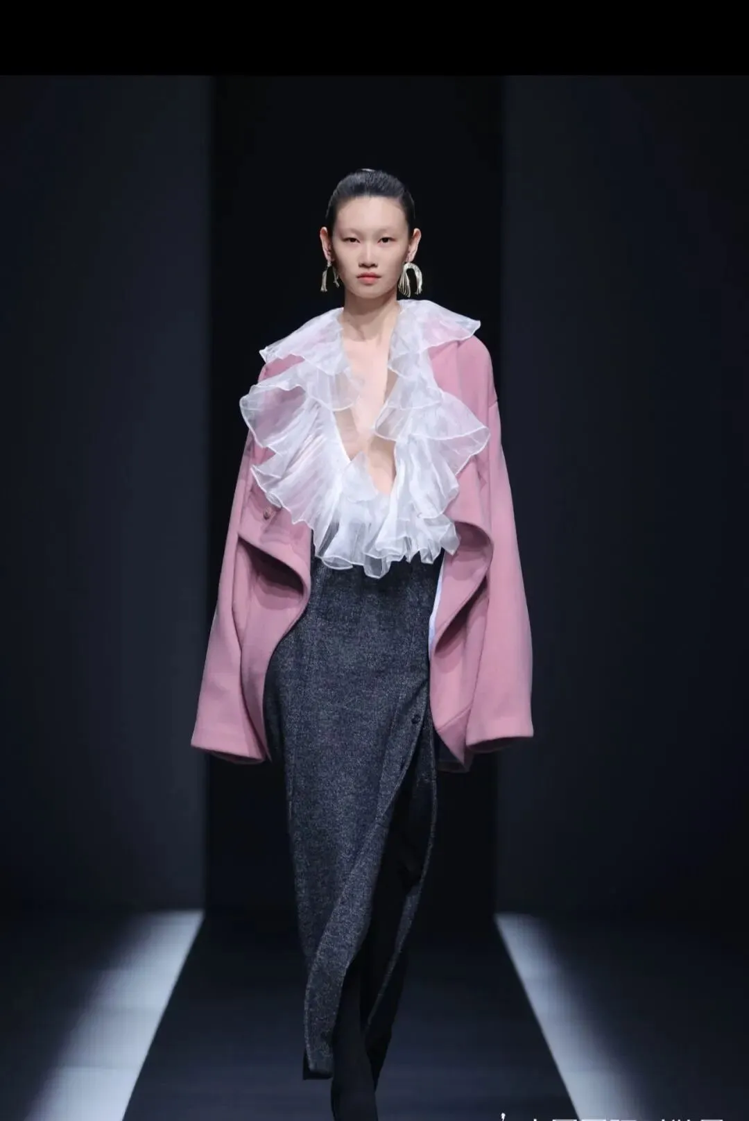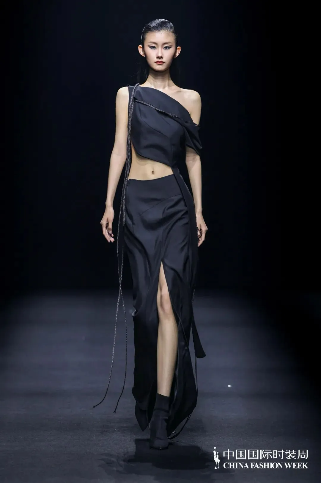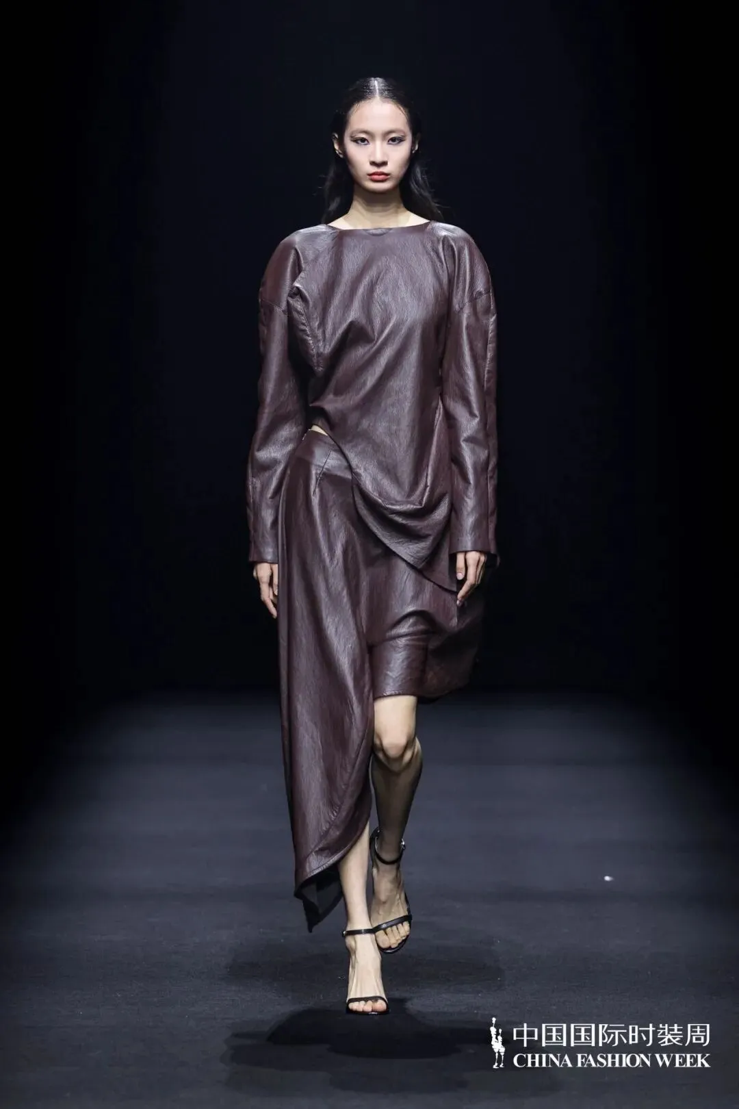 本季主题:川行与纪,本季设计理念介绍:山川为形,湖波为韵:流动的东方美学灵感溯源:天地自然的线条诗学,也是立体裁剪的山水实践,工艺上主要运用绳结技艺,将其运用在服装结构线中,强化结构线,突出服装空间感,是主题的意象表达,同时使用绳结工艺代替缝纫线,是绳结技艺的功能体现,面料上主要采用皮革和毛呢相搭配,部分搭配织带进行设计,将“行于山川”浓缩为一部纪实录,带有都市漫游与诗意探索的双重气质,既像一本旅行手记,也像一场时装纪录片。