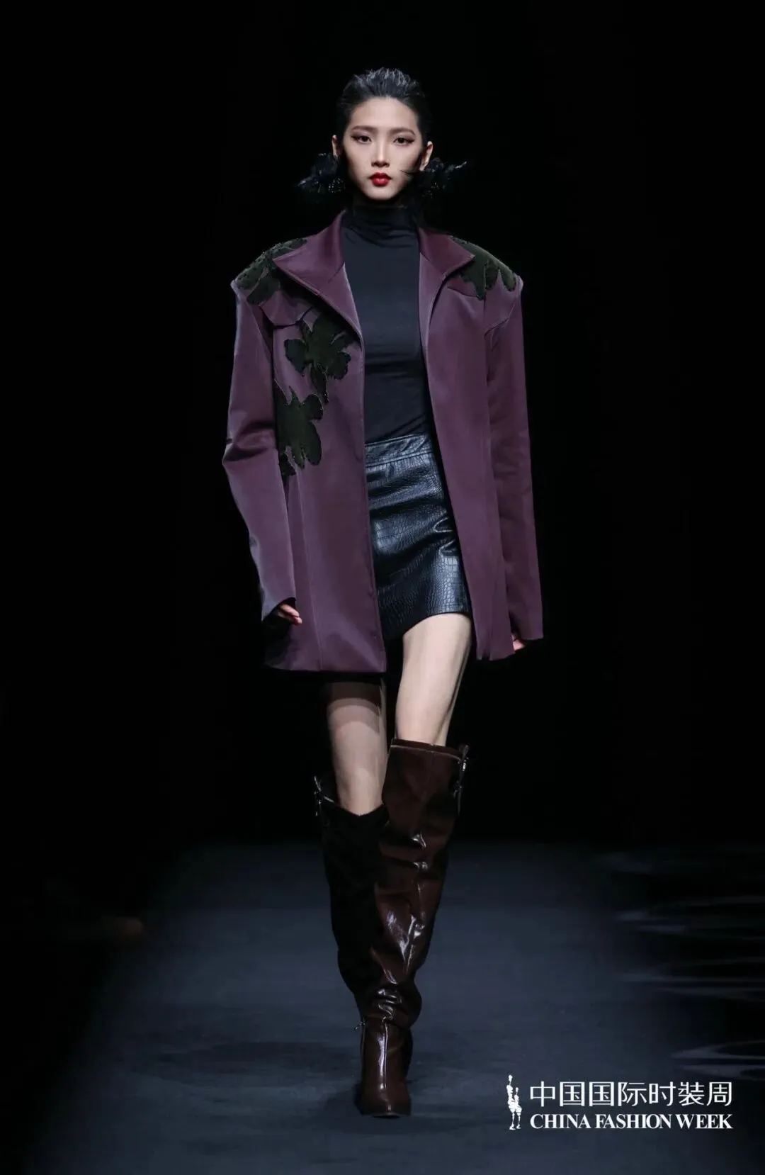 本次大秀以「月下见花归」为主题,清冷月华倾泻秀场,复古棕调皮革外套搭配经典格纹拼接,花卉切割工艺化作立体花瓣,光影流转间尽显浪漫层次。皮革的飒爽与柔媚花卉相融,不对称解构设计暗藏巧思,将复古浪漫与老钱式低调奢华完美交织,呈现内敛而高级的世家优雅。