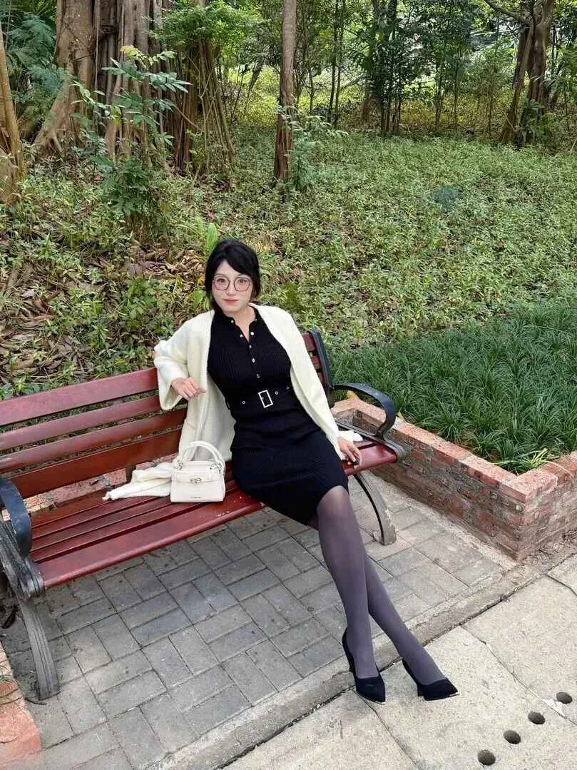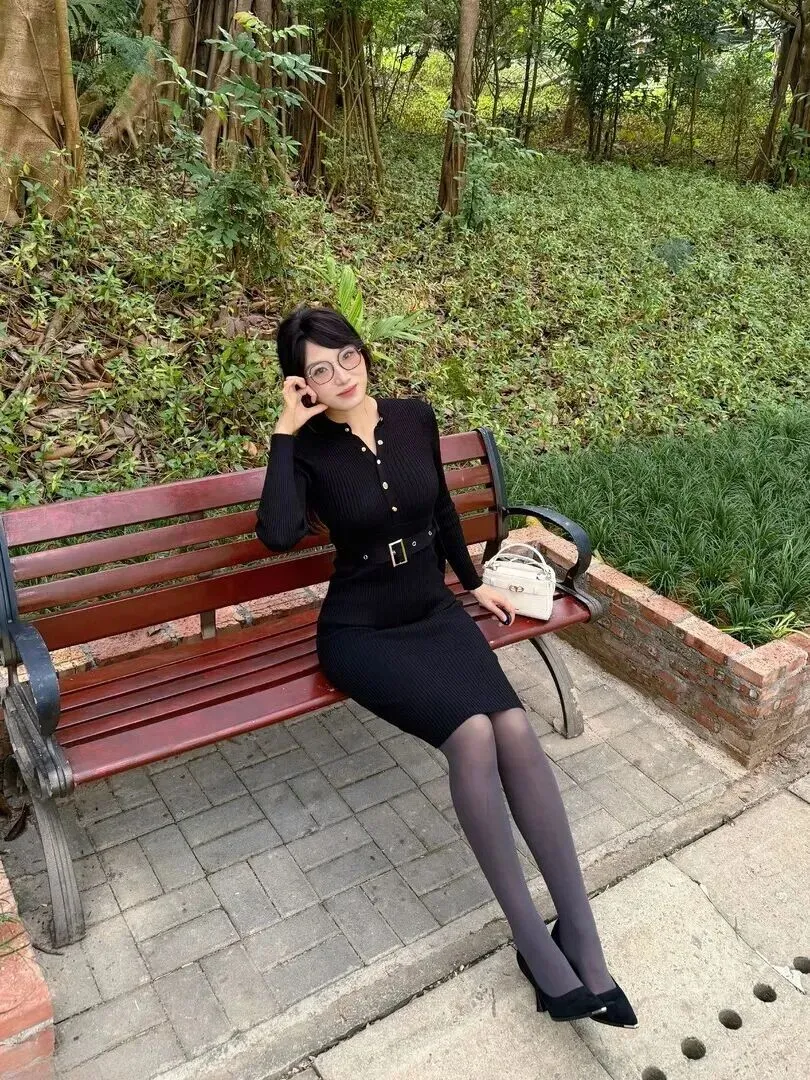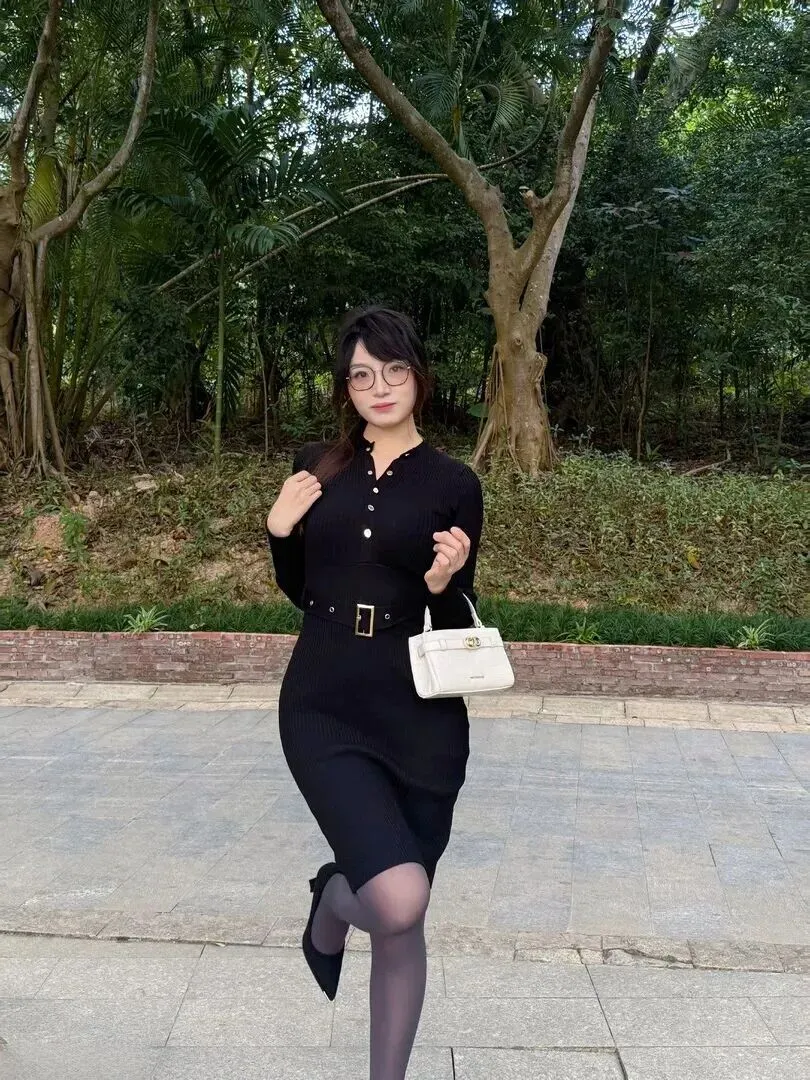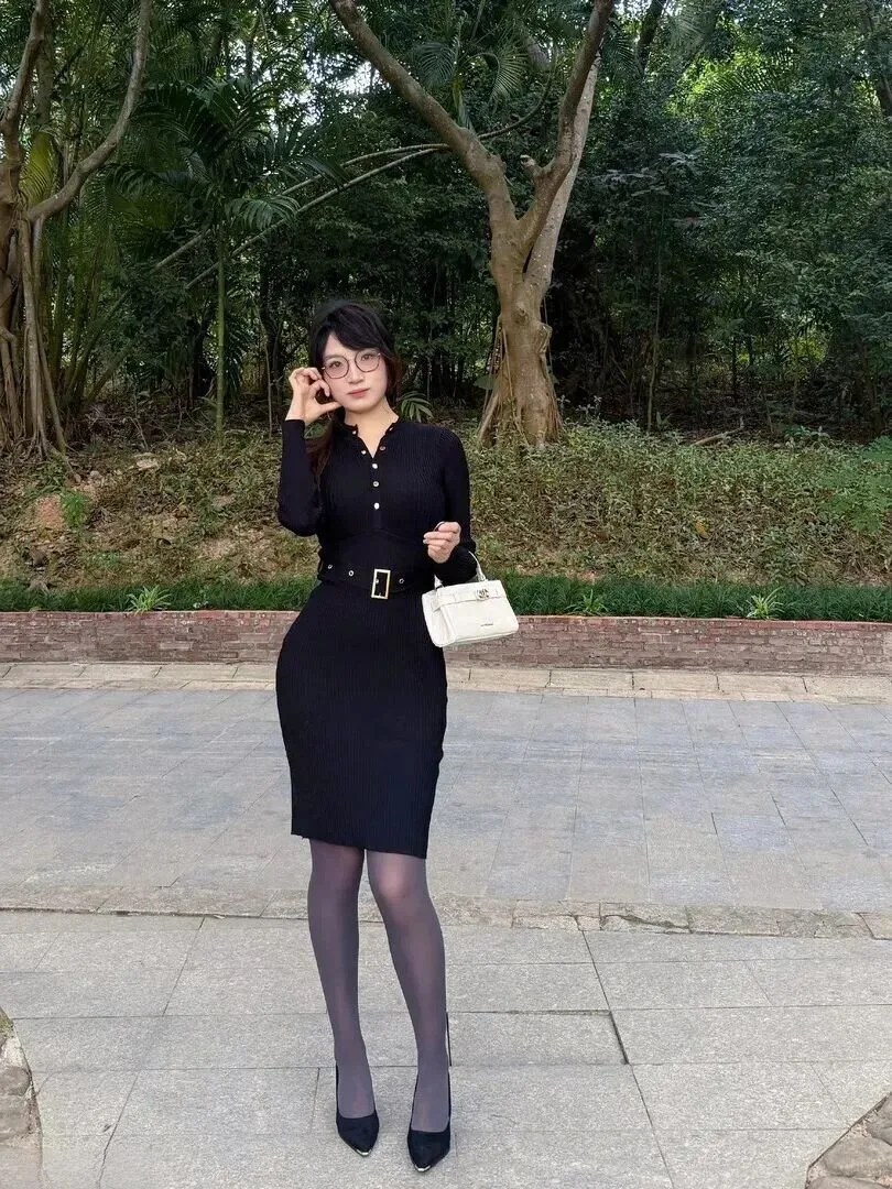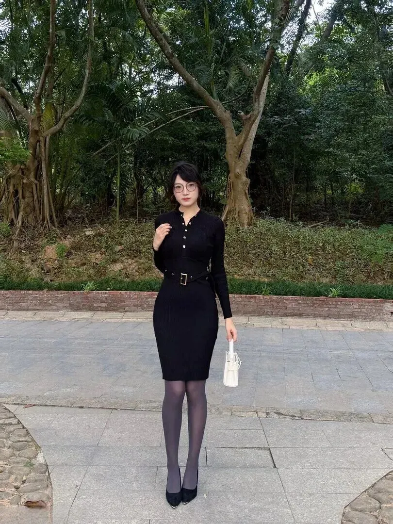 先对裙子做一番介绍。这身黑色针织连衣裙的面料选择得很好。竖条纹纹理摸起来有质感,穿上后马上显瘦。最妙处在于它能很好地修饰身形,腰腹部有肉肉也不会被发现。领口的一排金色小纽扣是焦点,低调之中有精致感。腰带一系,腰线抬高,整个人的比例就变得长了。