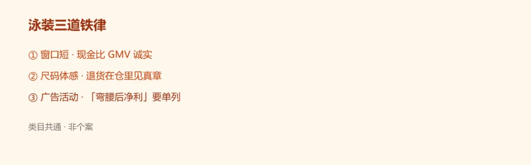 社媒、红人、度假场景图——泳装高度依赖「眼见为实」。对你:内容预算是 Opex,要和 退货率 一起放进模型。