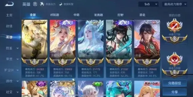 这个账号光是皮肤就有701款,大部分稀有限定皮肤全都有,单看皮肤就已经很有价值了,但真正让这个账号值钱的,是她的国标和分路实力。她不仅中路和游走都打到了百段,还手握33个大国标和十几个小国标,像镜、露娜、不知火舞这些操作难度很高的英雄,战力都在两万二左右,而且这些国标还是知名主播微凉帮忙打上去的,含金量可想而知。