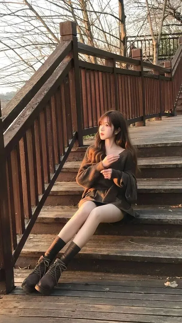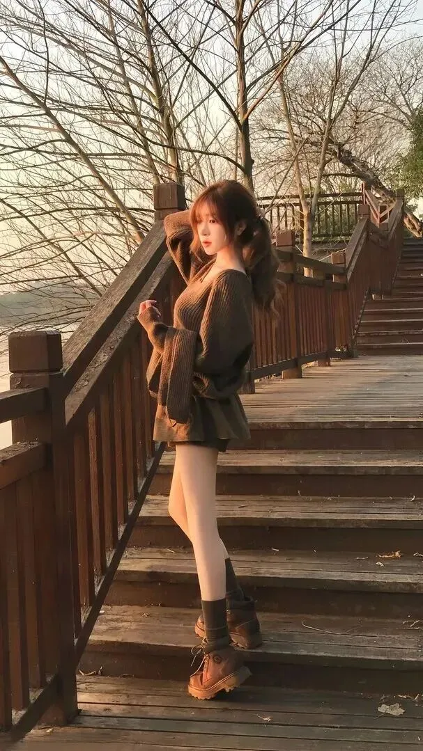 第二套就是温柔治愈系,一眼就可以被吸引住。深橄榄色的粗坑条针织毛衣V领设计显瘦,质地软软蓬松。穿同样的高腰短裙,颜色一致,整体高级,有很强的高级感。袜子为浅灰色中筒样式靴子为深棕色厚底工装鞋上层保暖下层轻薄着装。站在木质台阶上,背景为黄昏的光线、枯树,气氛非常强烈。喜欢温婉风格的女性,不可多得哦。