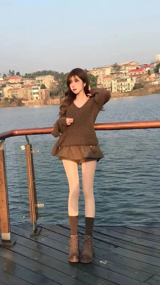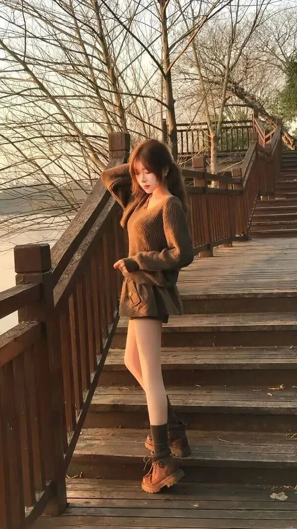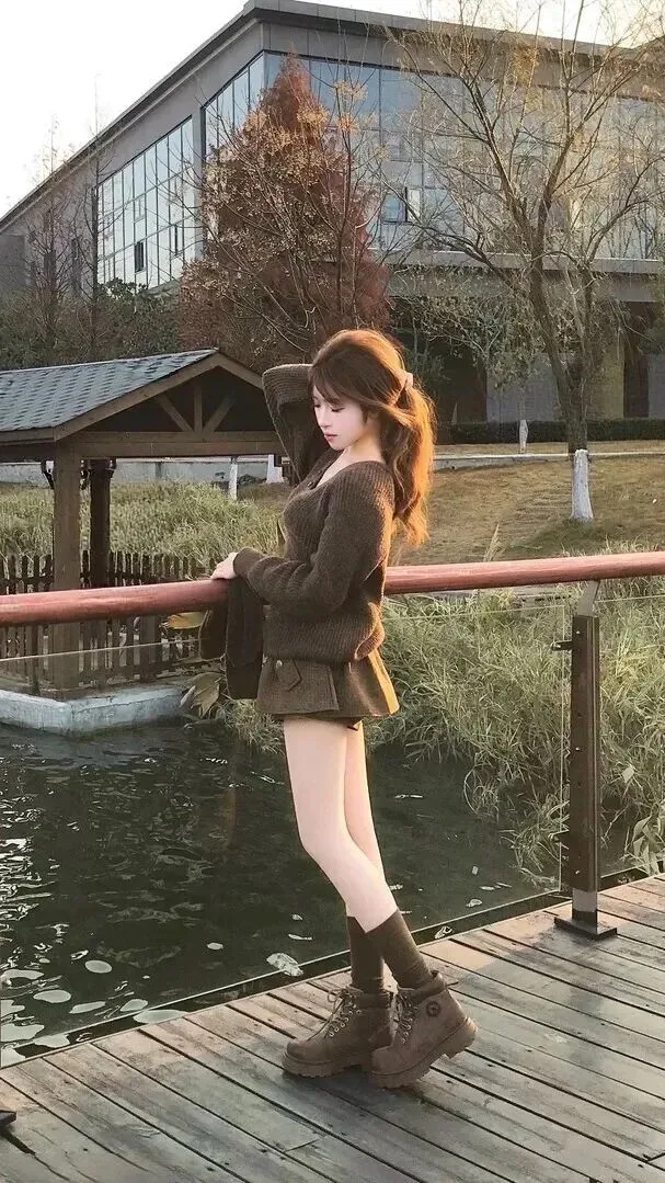 第六套大地色系优雅风,通勤日常两相宜。深棕色V领针织毛衣加同色系高腰毛呢短裙,竖坑条纹和翻盖口袋的细节更显出它来。打底裤用浅肤色,袜子选深棕色中筒堆堆款,靴子是厚底工装款,简约高级。站在临水栈道上,从远处的建筑和近景的自然环境中获得融合的感觉。该套适合上班或者日常出行,大方得体。