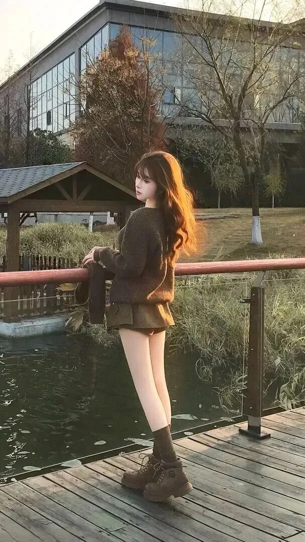 第五套温柔沉稳,文艺范浓。浅棕红色的长发在光线下泛着金橙色,温柔的美就藏在其中。毛衣为深橄榄绿色宽松款,同色系短款毛呢百褶裙为主打款式,质感高端。打底裤为肤色款,袜子为深棕色中筒针织款,靴子为麂皮材质厚底工装款,具有复古的风格。背靠水边的木栈道背后有亭子和水面,整体沉静优美,适合文艺少女。