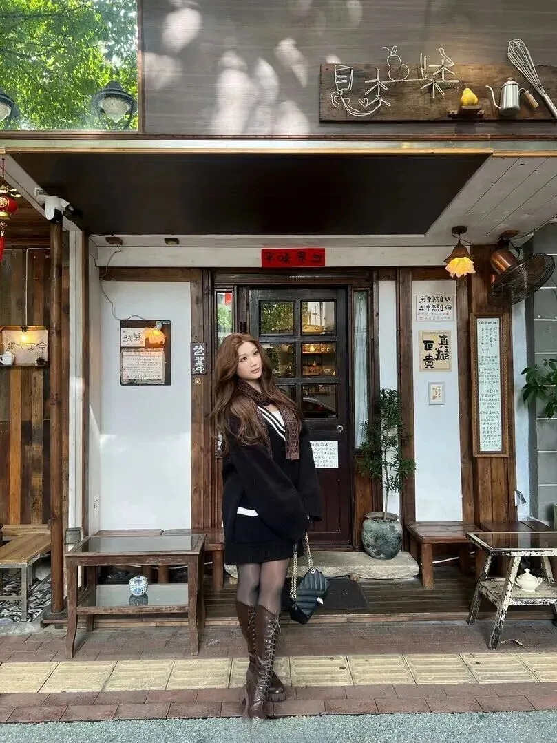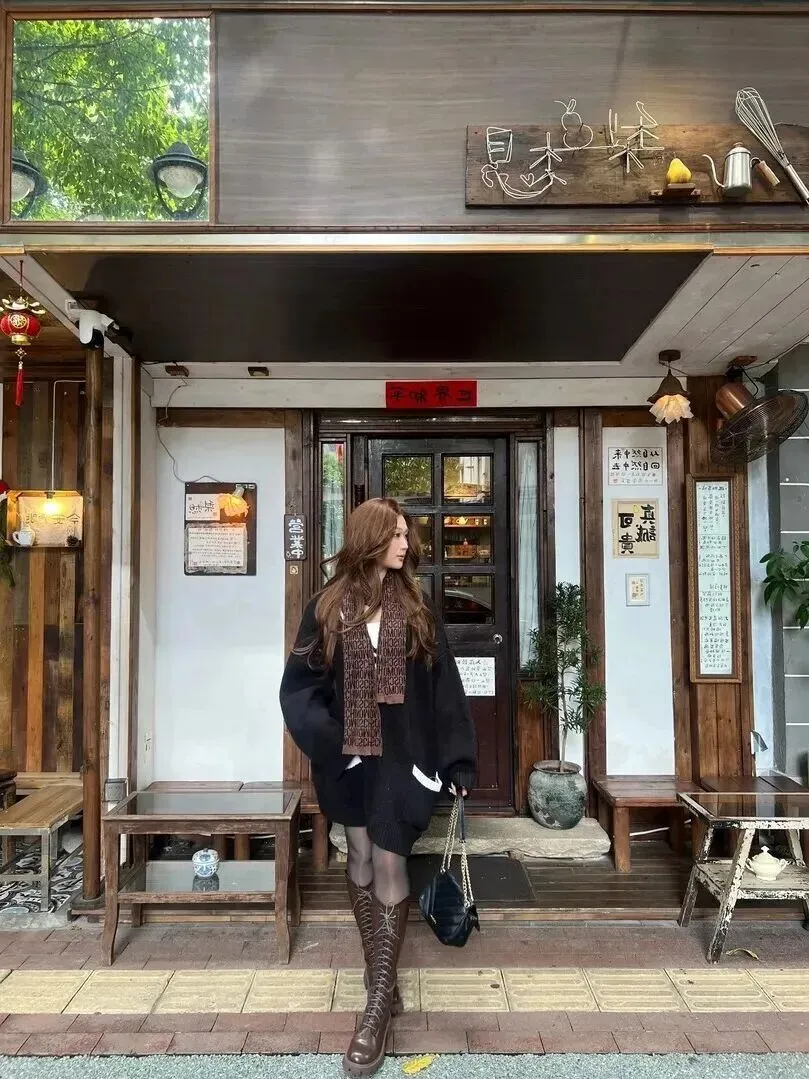 她挽着双臂,坐在店里复古气氛当中,非常合乎情理。丝袜、棕色长靴的原配既能保暖又能时尚。这套衣服室内外都可以穿,实用值满分。