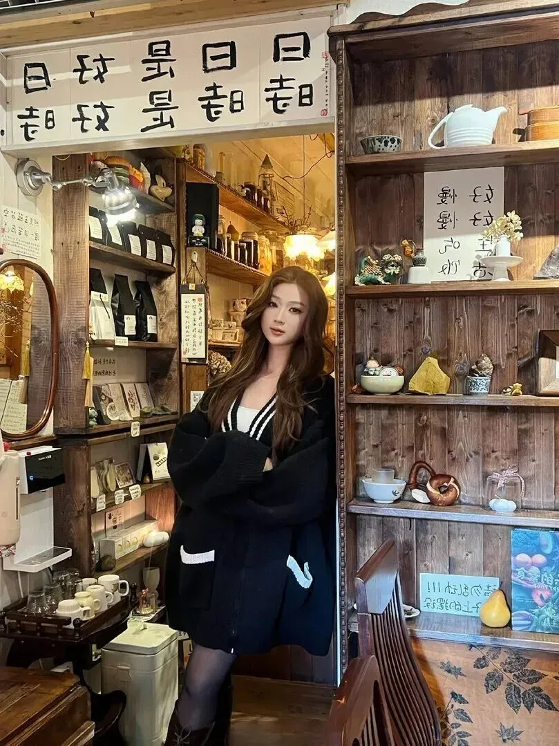 走进店里暖和一下,她换上一件黑色针织开衫,柔软的质地看着就很舒服。领口、口袋边上点缀白色条纹的多了一些休闲感。里面穿着一件白色的背心,领口稍微露出,打破了黑色的沉重感。