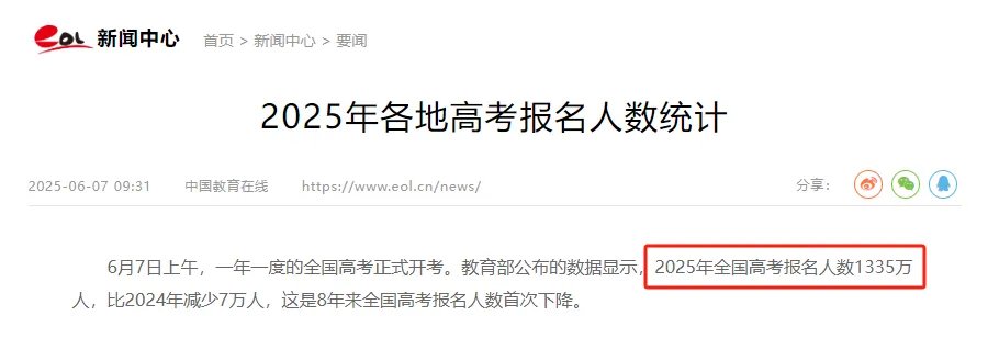2025年高考刚刚落幕,全国高考报名人数为1335万人,比2024年减少7万人。