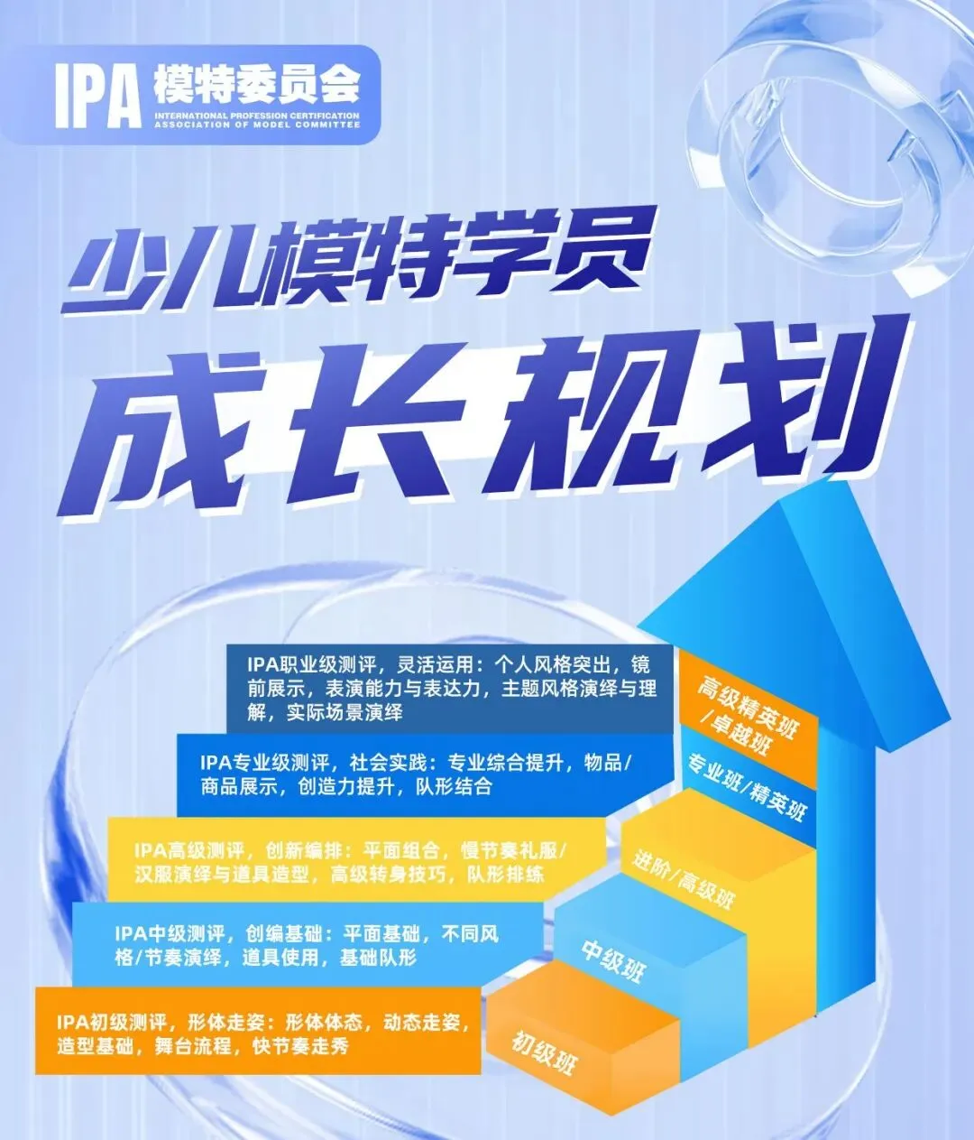 IPA 为少儿模特学员制定了清晰的成长规划。从初级班的形体走姿、造型基础,到中级班的创编基础、不同风格演绎,再到高级班的创新编排、平面组合等,能力逐步提升。专业级和职业级测评则更注重社会实践、个人风格展现等综合能力。
