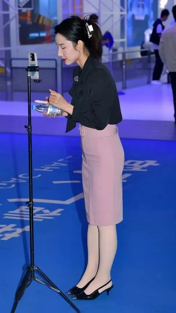 她走的是一种职场丽人路线。黑色衬衫和粉色调的半身裙搭配着比较成熟大方。再加上黑色高跟鞋,整个人的气质就会提高一截。搭配方式适合于各种情况,不会出错。