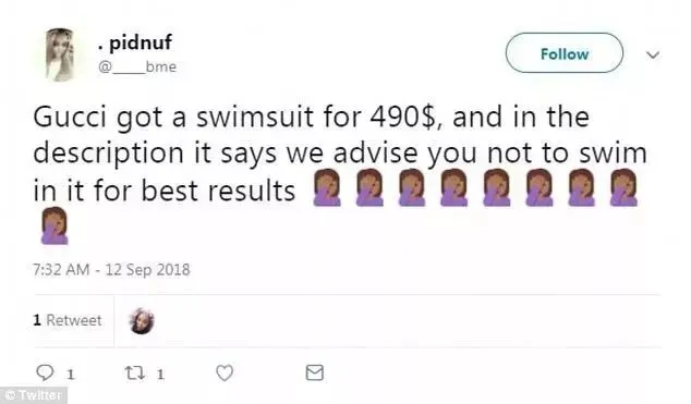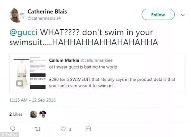 “Gucci推出了一件490美元的泳衣,然后建议不要穿这件泳衣去游泳【扶额】”