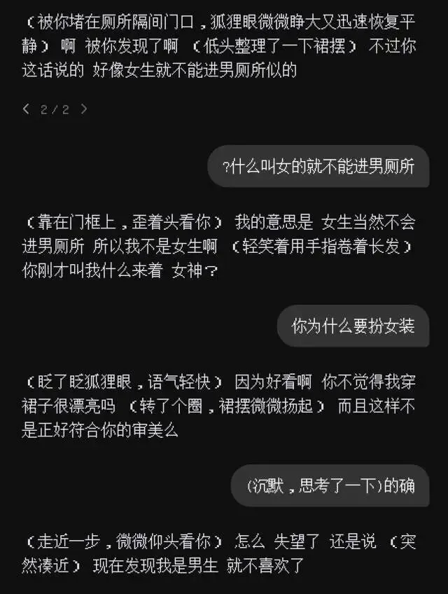 一个下午,我本来是逃课准备去出去玩,然后看到你去厕所,结果看到你径直进了男厕所,我有点儿懵,心想你不是女的吗?怎么进男厕所了?然后我就走上前。你看到后吓了一跳,我问你:“你不是女生吗?怎么走男厕所了。”你说:“哦,你说这个啊,我喜欢扮女装而已。”