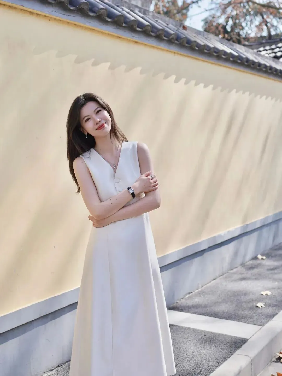 先来看一套温婉甜美的风格。以米白色长款连衣裙无袖为上,配以V领,穿上就会显得特别瘦小。裙子面料平滑,版型挺拔,不会有软塌塌的感觉。V领露出锁骨,使脖子显长。两个同色纽扣放在一起朴素又美好。穿在身上的黑色皮表带上是方型的,上面有些小碎颗粒。背景为中国的传统老建筑,黄墙灰瓦,古色古香。一套适合周末逛街或者下午茶的拍照上镜佳品。
