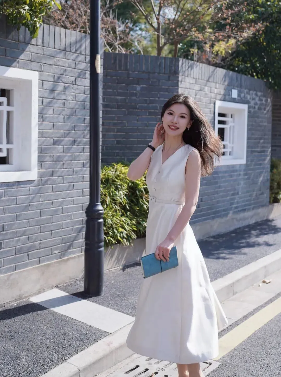 接着是优雅名媛风。这条裙子同样是米白色,无袖V领,但是腰部做收腰处理,用细腰带来系住腰部,腰线一下子显了出来。A字裙摆走路时飘动着,很活泼。拿着一块雾霾蓝色的手拿包,虽然颜色不鲜艳但是具有高级感。背景为青砖围墙、老式路灯,立马就有了一种老上海的韵味。此套服饰适合于参加正式宴会或者晚宴时穿着,具有庄重的气派而不失女性柔美之感。