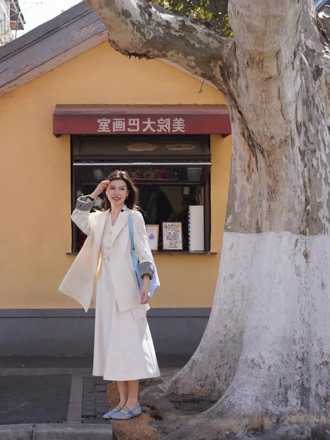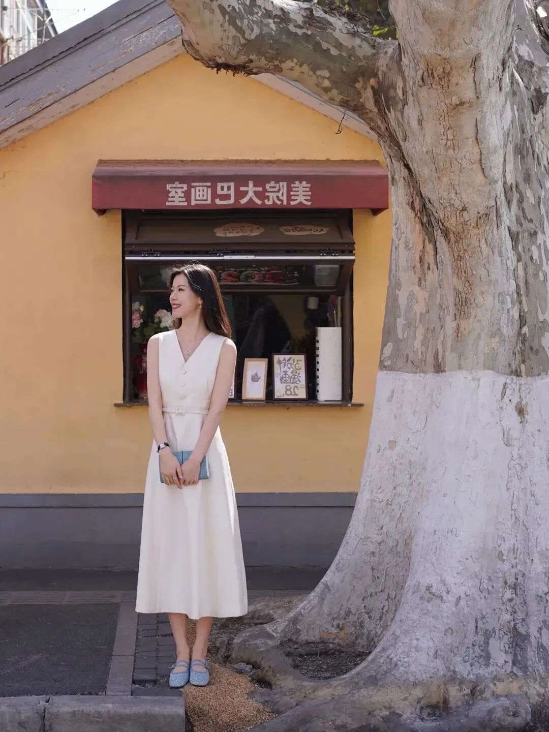 第三套就是清新文艺风。同样的米白色连衣裙配上浅湖蓝色的拿手包、玛丽珍鞋就显得非常协调。鞋子上还有小圆孔镂空,更加可爱。小文艺店和梧桐树总体上比较轻松,是种类似电影的环境。这是一套更利于性格内向,喜欢宁静的人外出散步或阅读使用,且更加得体的穿搭。