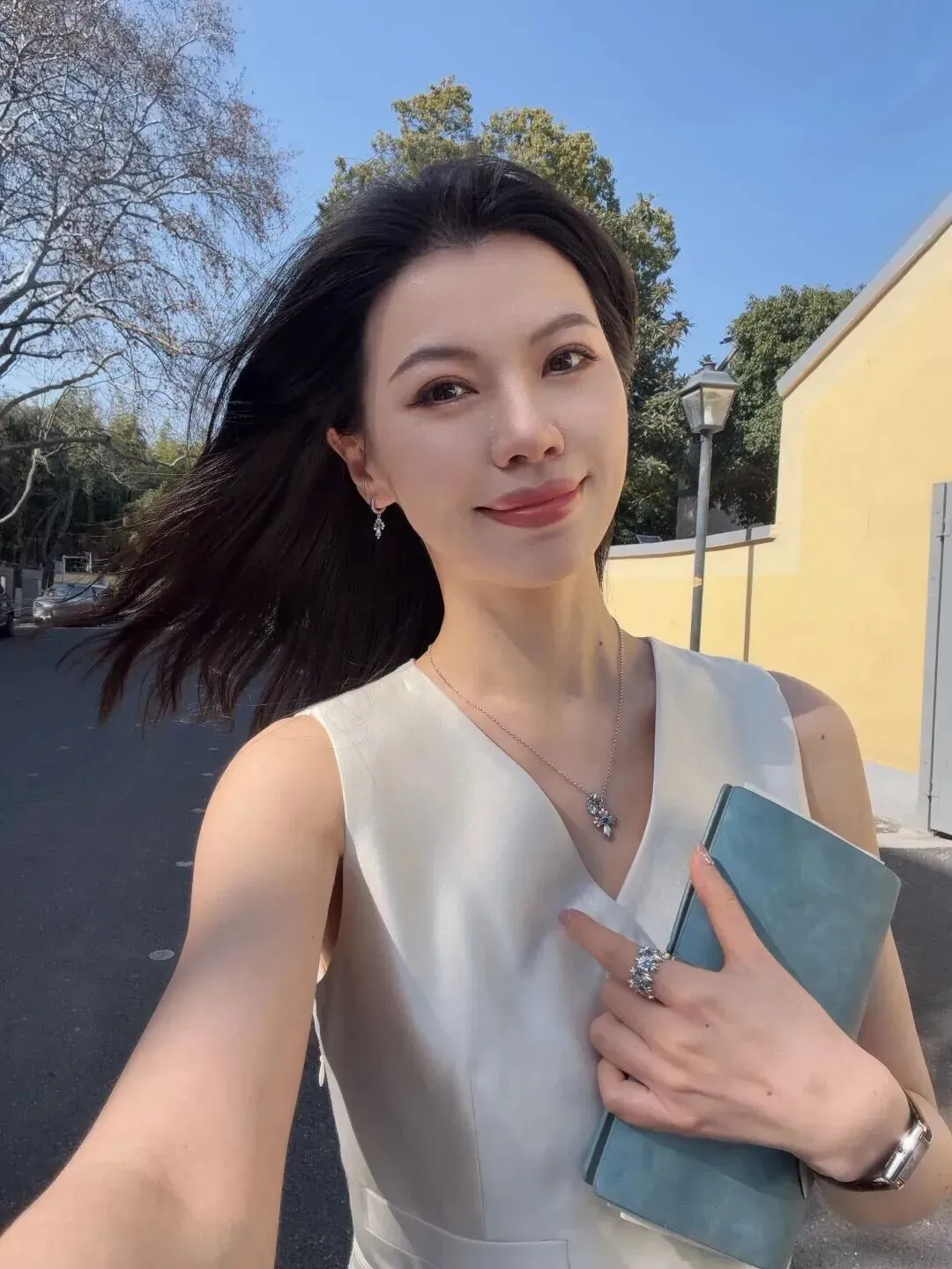 最后一套简化的气质风。简单白色无袖连衣裙,无多余的修饰,全部依靠剪裁来表现。银环形耳环、十字项链很优雅。手腕戴上了配有金属边框的智能手表,带有一定的科技感。春天蓝天绿树背景下的自拍照。该套衣服适合各种场合,简洁大方,突出好的气质。