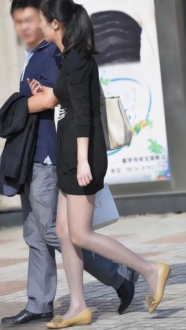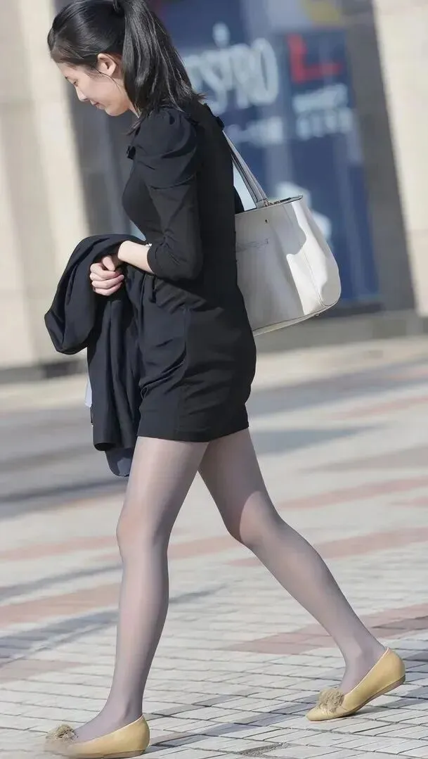 下面搭配的灰黑色透明丝袜,薄薄一层贴在腿上,如果隐若若的感觉刚刚好。脚上的平底鞋颜色是浅咖色的,鞋头处有一点儿毛绒感的装饰品,行走时候特别轻巧。许多女生认为通勤必须穿高跟鞋,其实选择平底鞋一样可以显高显瘦,关键在于一天脚不疼。