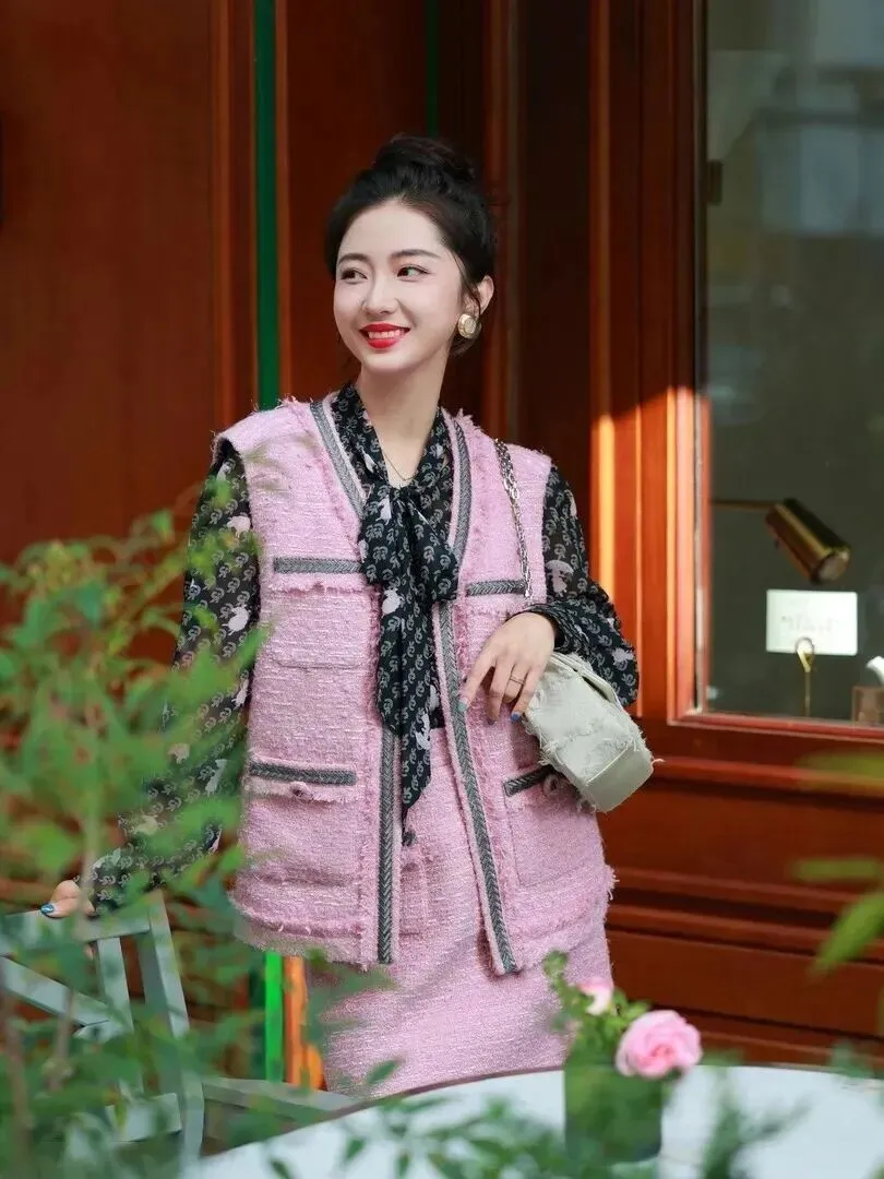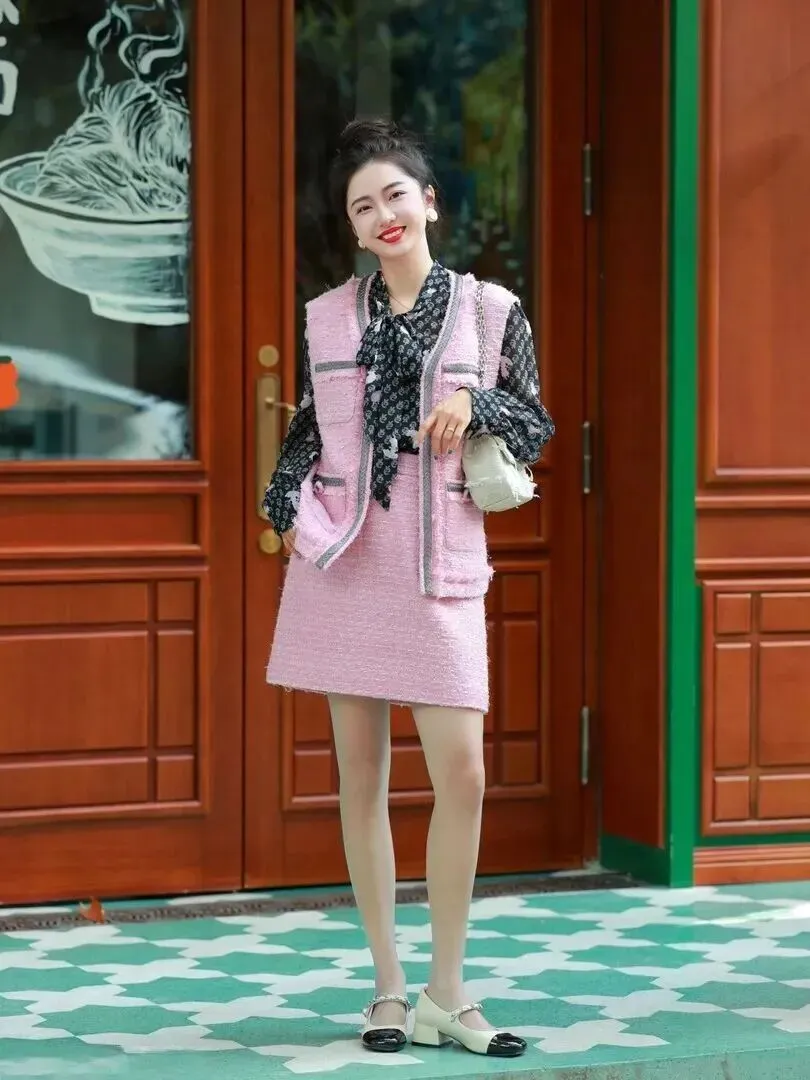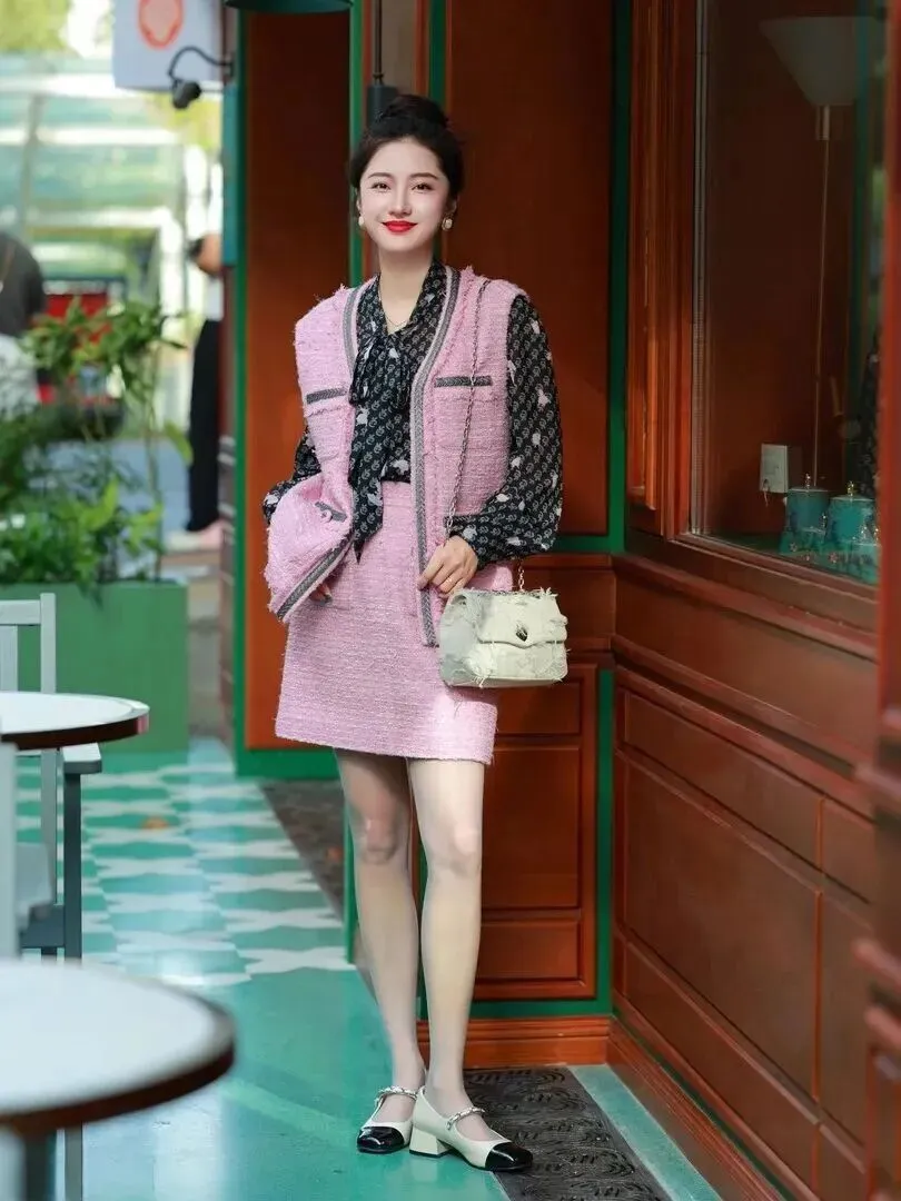 穿过的衣服才是核心。粉色粗花呢马甲搭配高腰短裙,很好地勾勒出了完美的身材曲线,小蛮腰和大长腿一览无余。内搭黑底碎花雪纺衬衫,在粉色基础上去掉了多余的艳丽颜色,呈现出现代化又带点怀旧风格的感觉,在甜酷之间取得了均衡的状态。