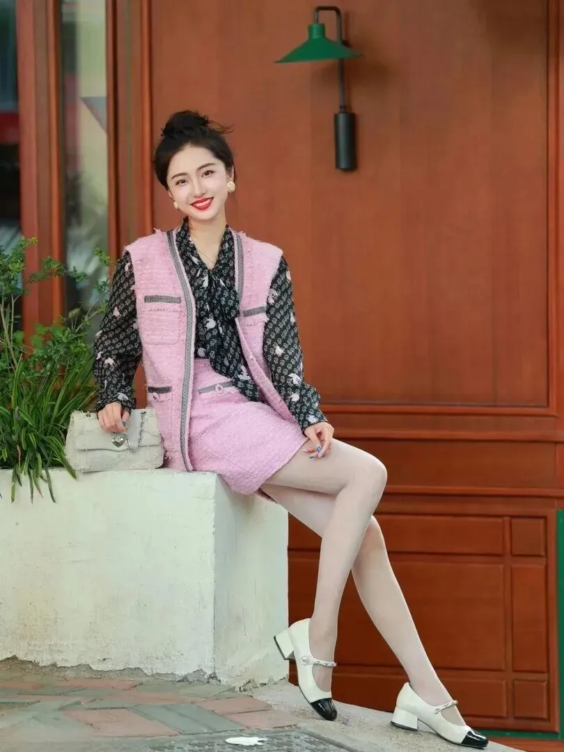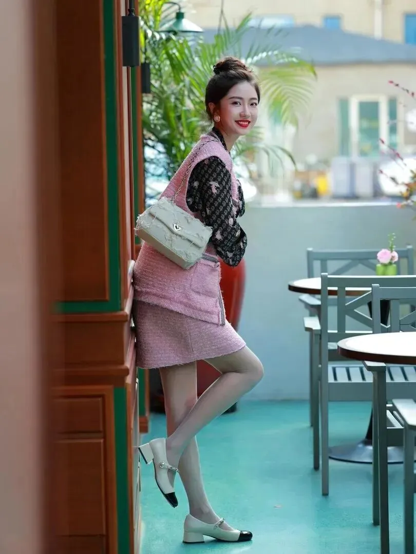 鞋子和包的选购也很有讲究。米白色的玛丽珍粗跟鞋既有典雅大方的气度又有很好的舒适性,粗跟能将腿长拉高的感觉提起来。链条包是小香风的魂,菱格纹经典百搭,链条增大了复古感,可以做斜挎也可以当单肩包使用。