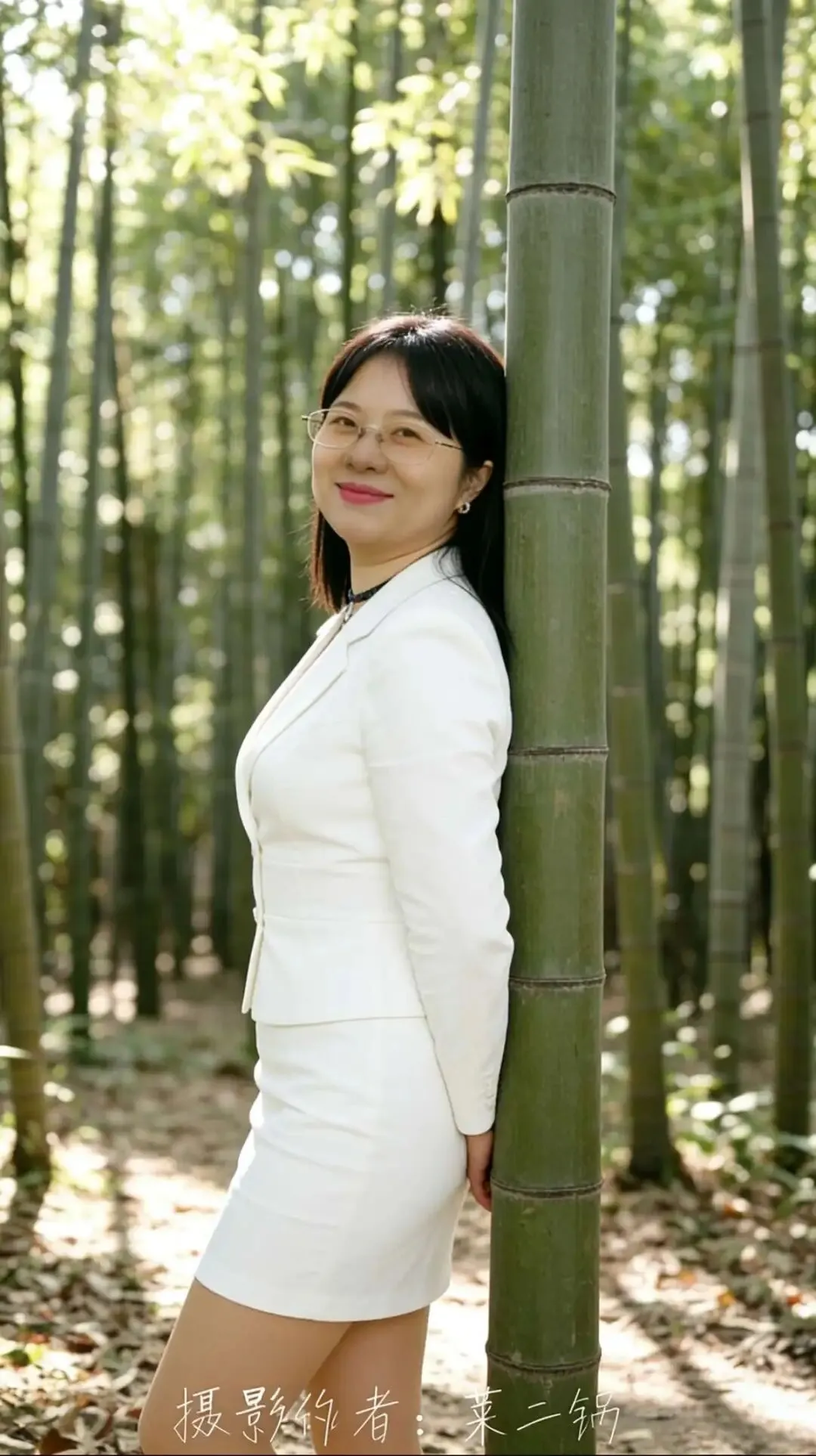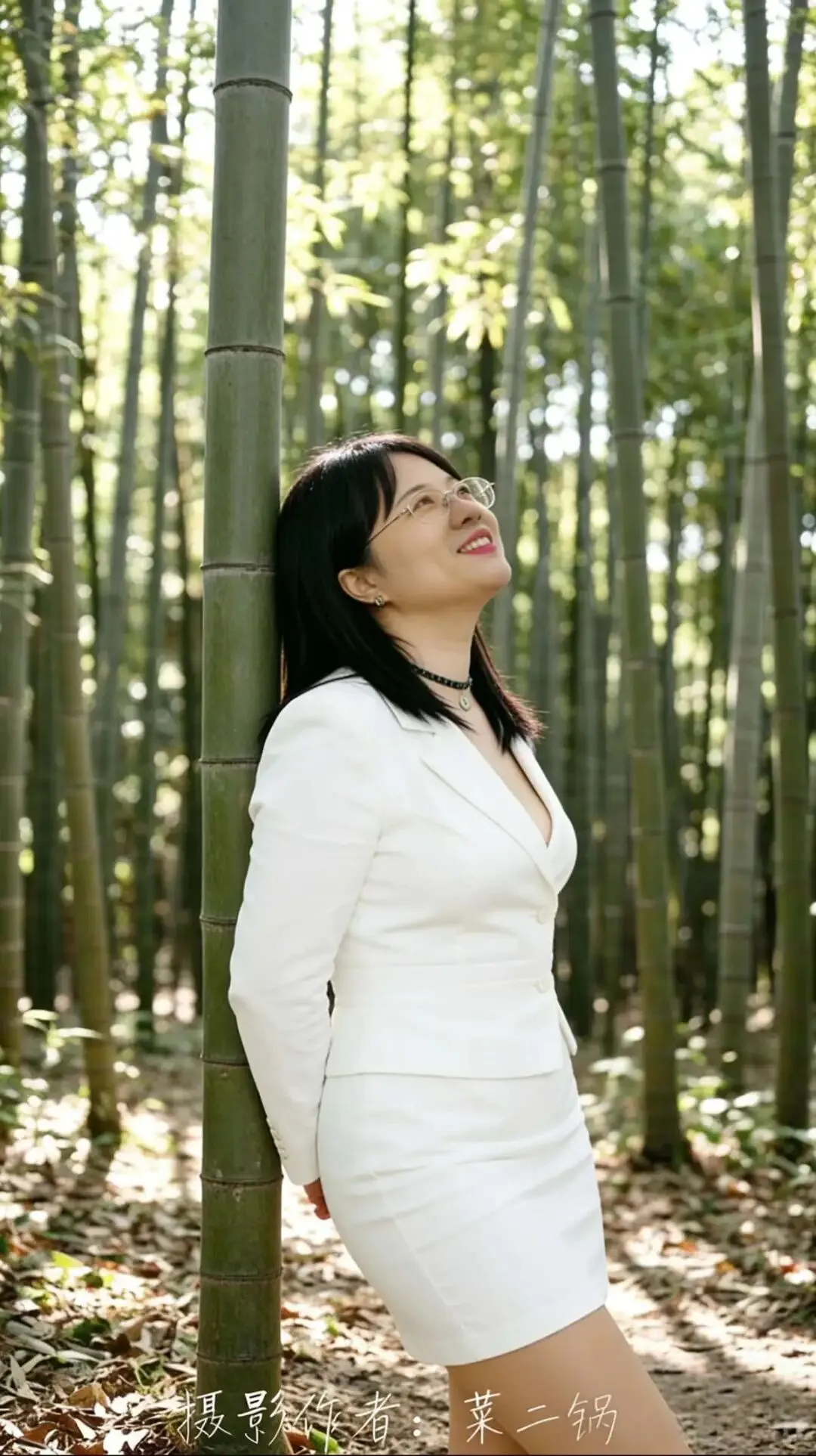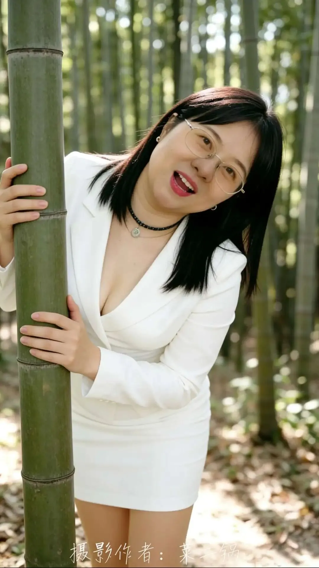 • 构图:侧身站位,利用竹子做背景分割,突出身体侧面曲线,视觉更显瘦。