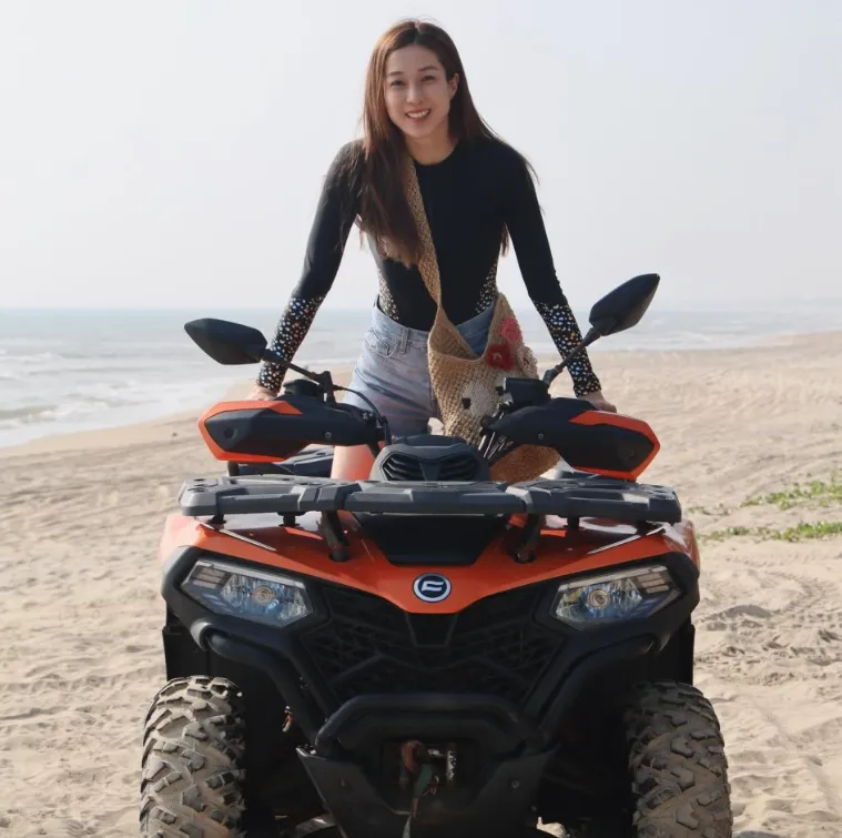 她自信地开着沙滩车,对着镜头露出灿烂的笑容。时而专注地在沙滩上驰骋,任由海风吹乱头发,画面看起来非常惬意。