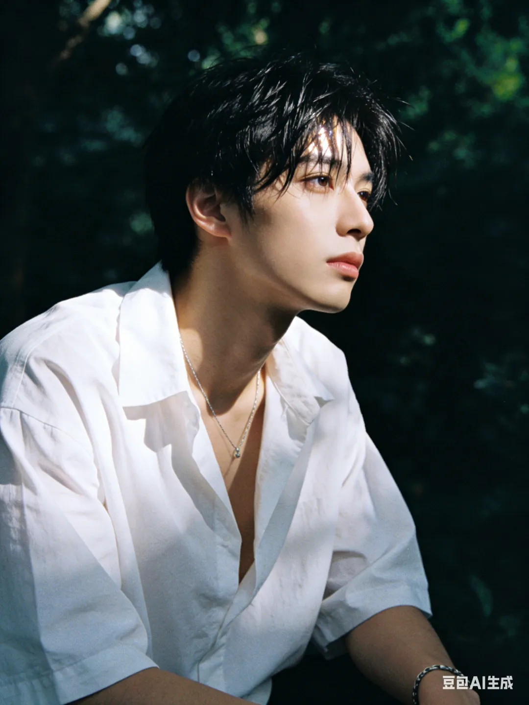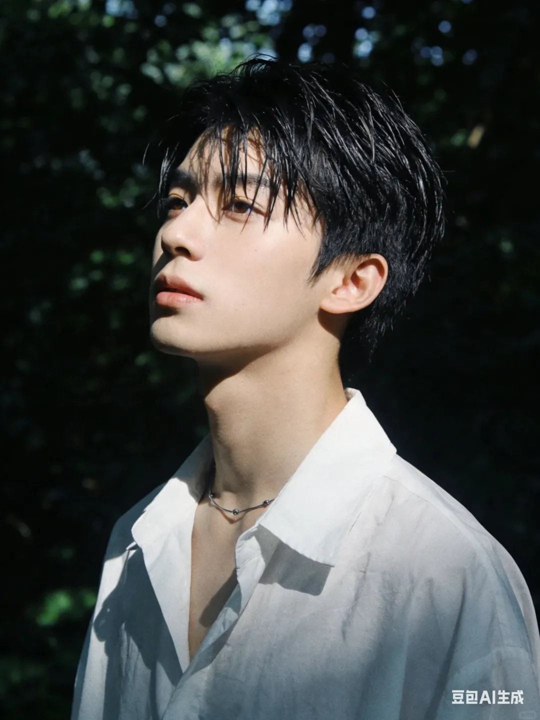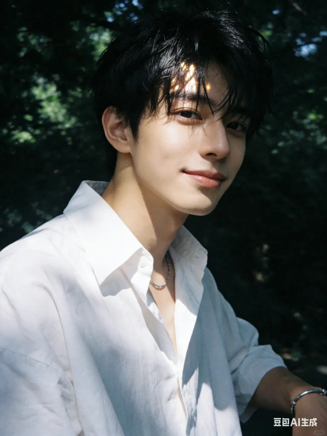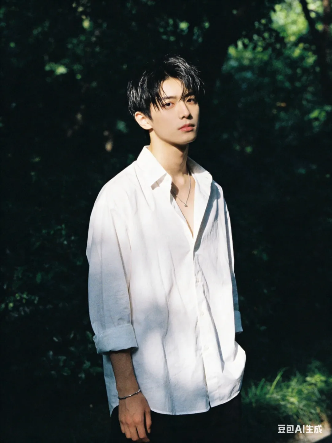 背景:夏日户外,茂密绿植,树荫斑驳,暗调虚化突出人物,无过度修图,无夸张滤镜,保留真实质感与光影层次