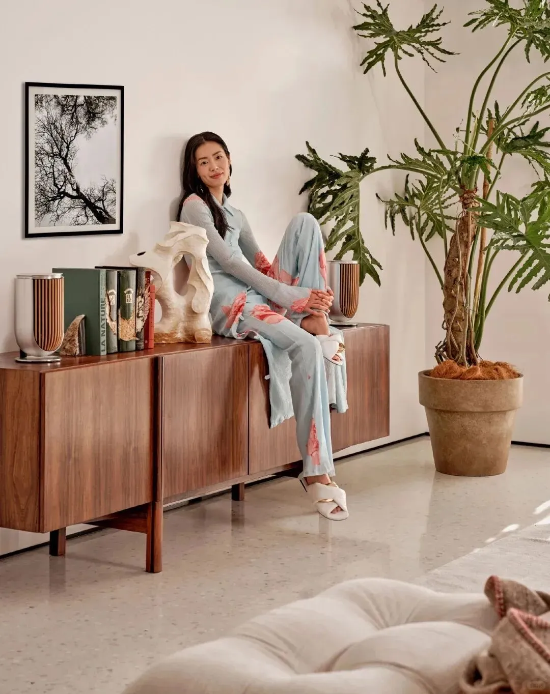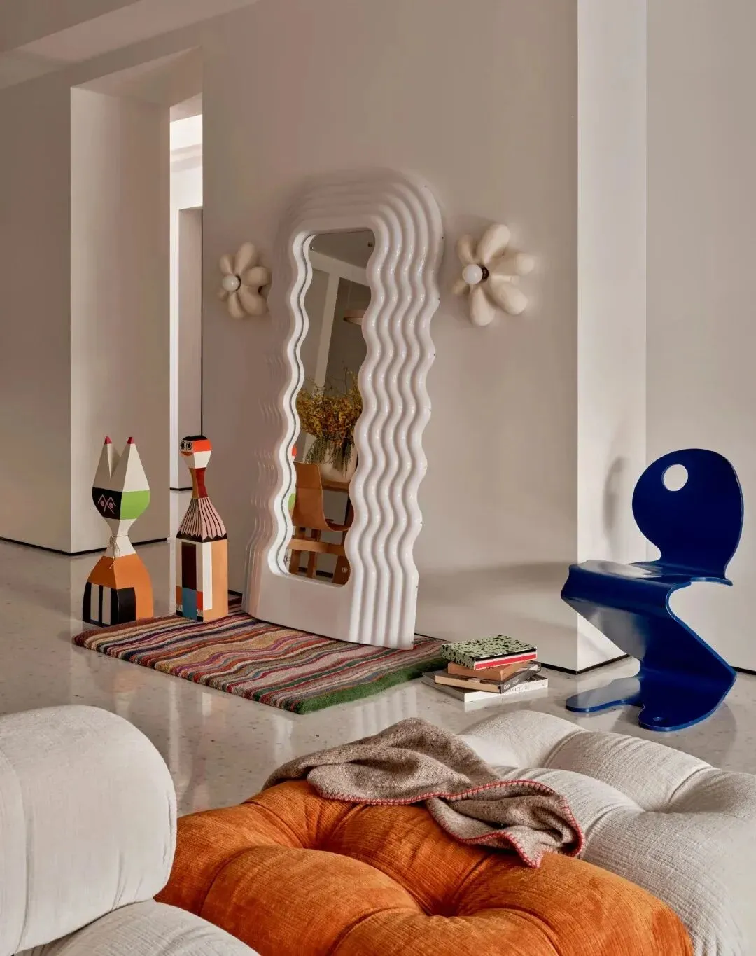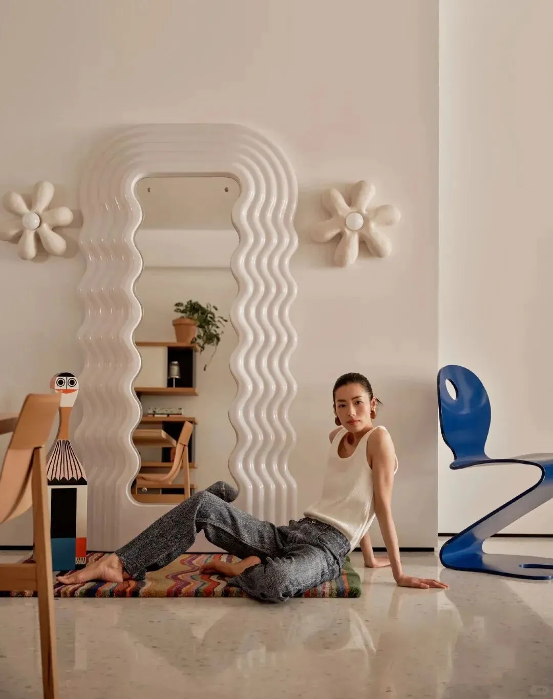 最点睛的是那件中古柚木边柜,温润的木色与空间中冷色调形成对话,柜子上摆着她从世界各地淘来的艺术品。对面立着一面Ultrafragola波浪镜,曲线灵动,恰好平衡了中古家具的厚重。
