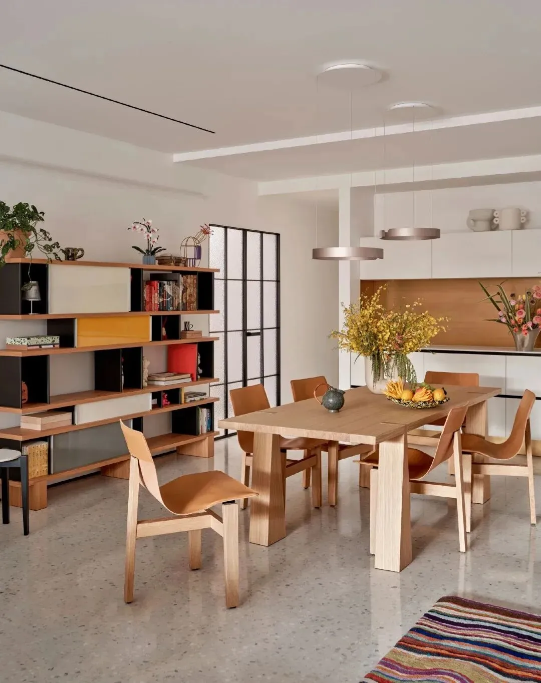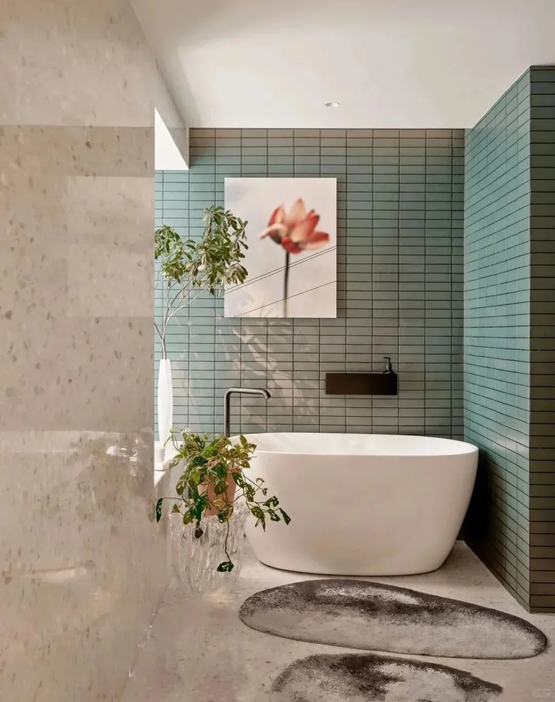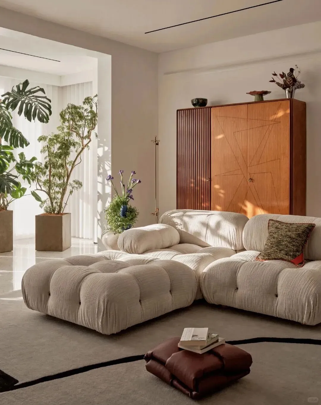 最点睛的是那件中古柚木边柜,温润的木色与空间中冷色调形成对话,柜子上摆着她从世界各地淘来的艺术品。对面立着一面Ultrafragola波浪镜,曲线灵动,恰好平衡了中古家具的厚重。