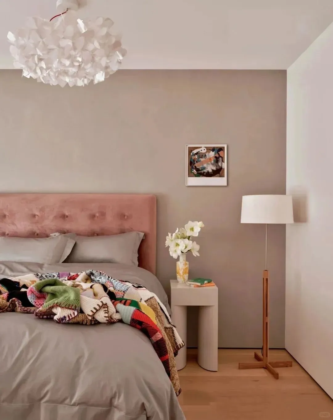 卧室用了脏粉色定制床,高达80cm——这是她的小仪式感:像孩子一样跳上床、跳下床。床尾没有传统床头柜,只放了一盏落地灯和一束小花,简单却有温度。