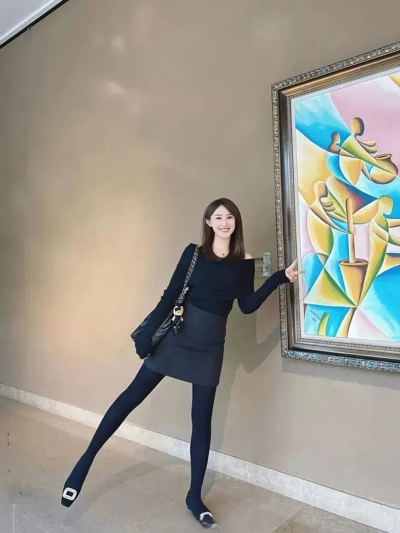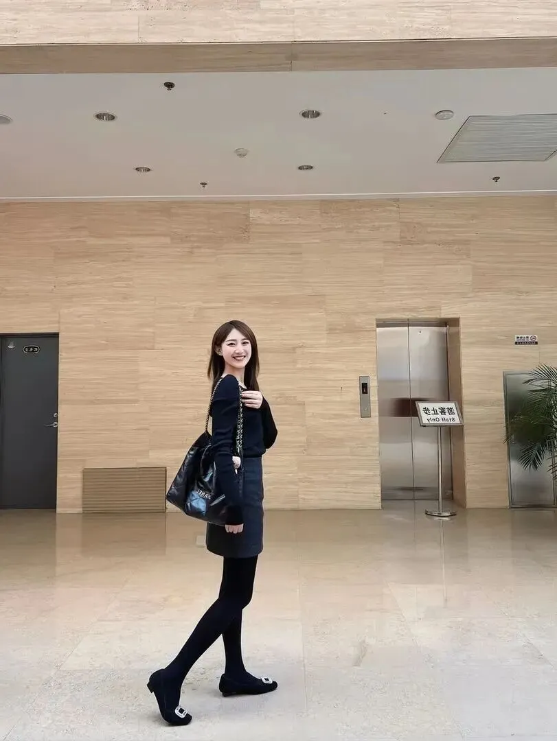 首先来看第一套黑色露肩针织上衣+深灰色高腰短裙。穿上之后立刻有增高又显瘦的效果!露肩设计如果只遮盖住一部分的锁骨,就会有小性感的感觉,但是不会很夸张。高腰短裙会拉长腿部线条,搭配连裤袜和方头低跟鞋就会形成一种利落又带有点型的气质。低跟鞋走路舒服,用途广泛。这样穿起来气质就来了。