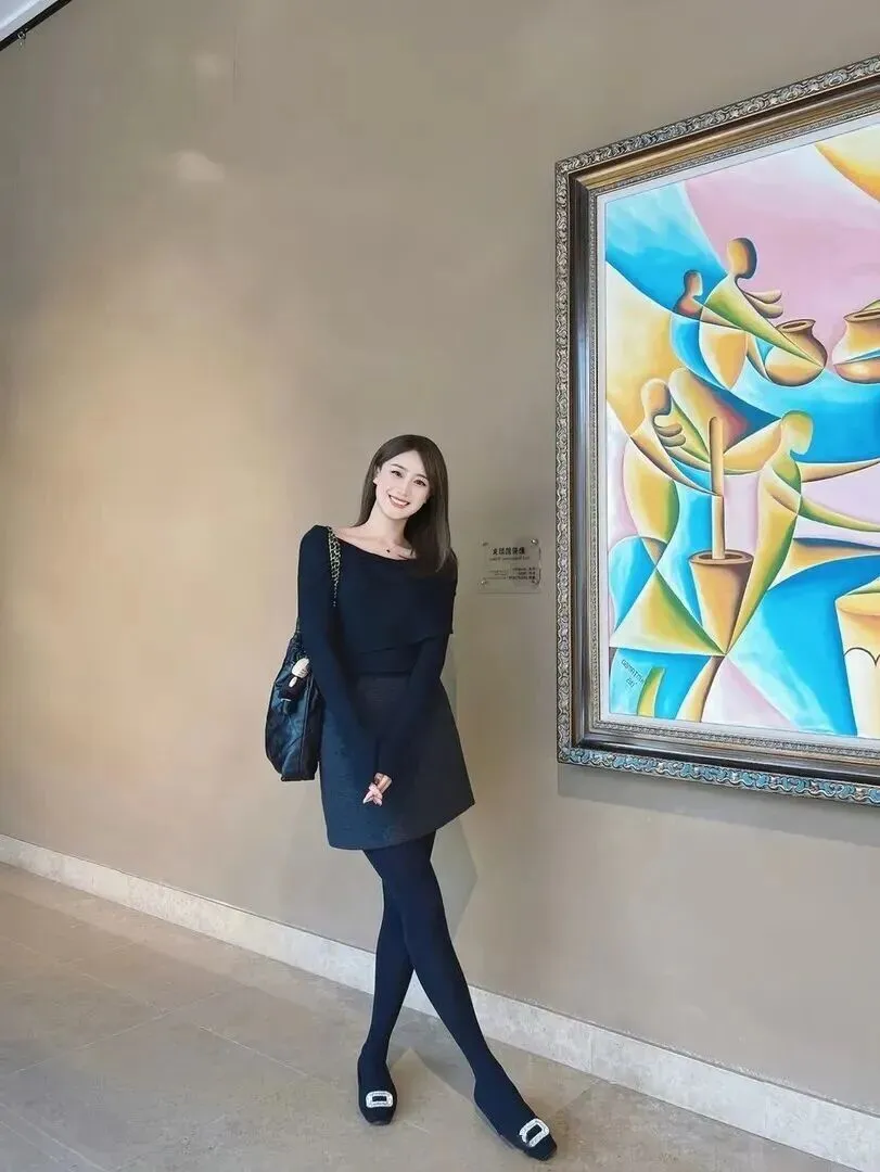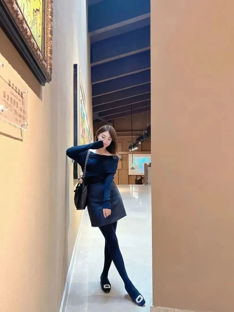 第三套以美术馆为舞台,是以收藏品的展览形式为基础所设计的时装,以蓝白撞色为基调、搭配有深灰色的皮质短裙。皮质裙子的哑光质感给高级感来了个直接提升。一字肩设计温柔地包裹肩颈,显得整个人柔美大方。连裤丝袜为藏蓝色,与上衣一致,同色系搭配太聪明了。鞋子上嵌入的金属扣装饰使得造型更加精致。