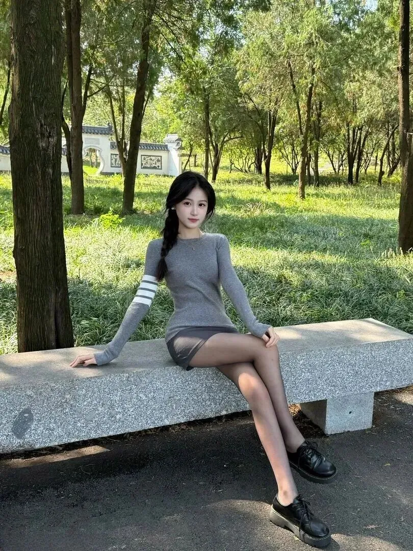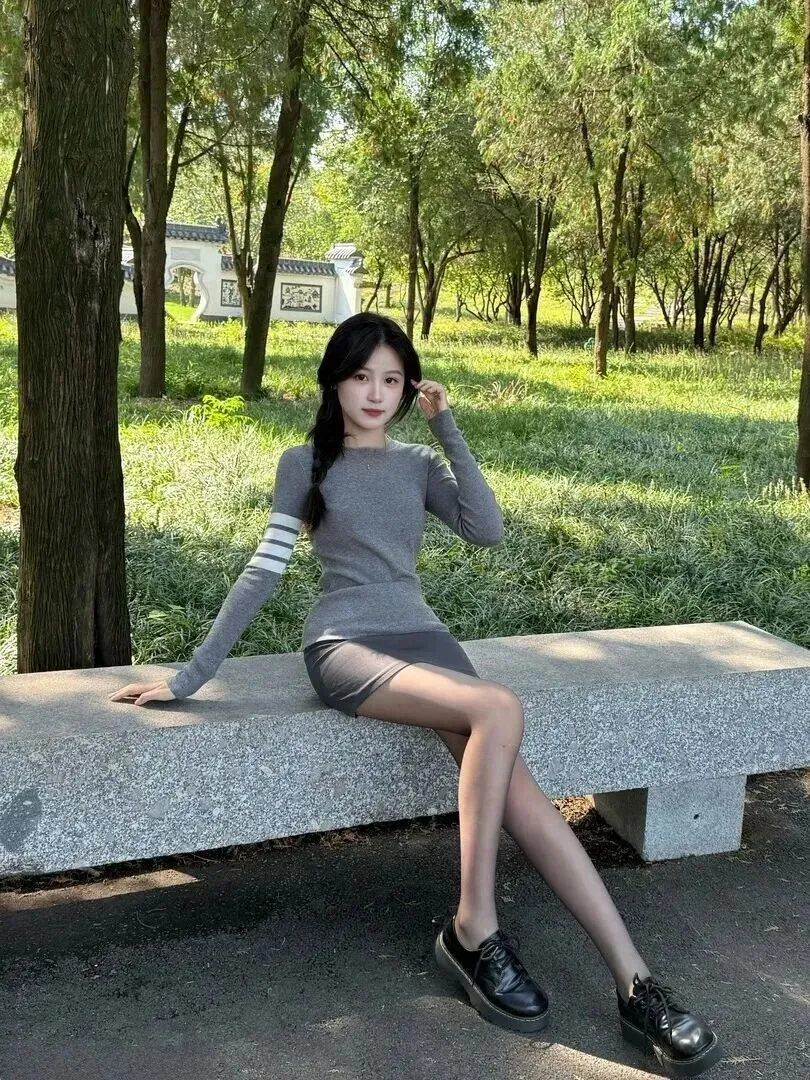 下身加一条深灰色的包臀短裙,颜色比上衣深一些,上下有层次感。裙子长度到大腿中间处,不短也不长,具有青春气息而不至于太过暴露。姑娘穿的黑色厚底皮鞋、浅灰色丝袜,人们穿的颜色相同又和谐。灰色系穿搭最怕的就是沉闷,但是这样搭配下来,一点都不会觉得无聊,反而有一种清新的活力。
