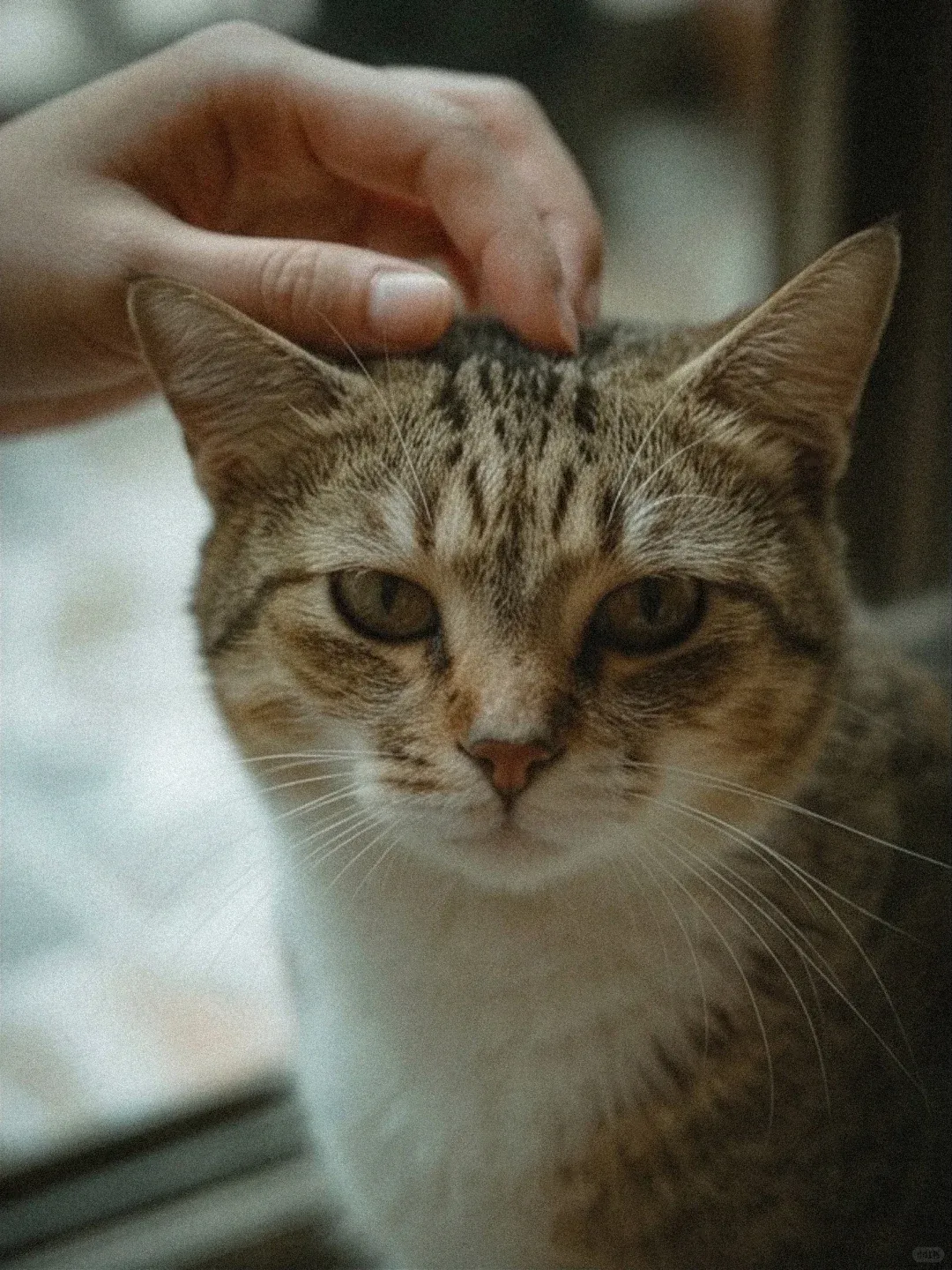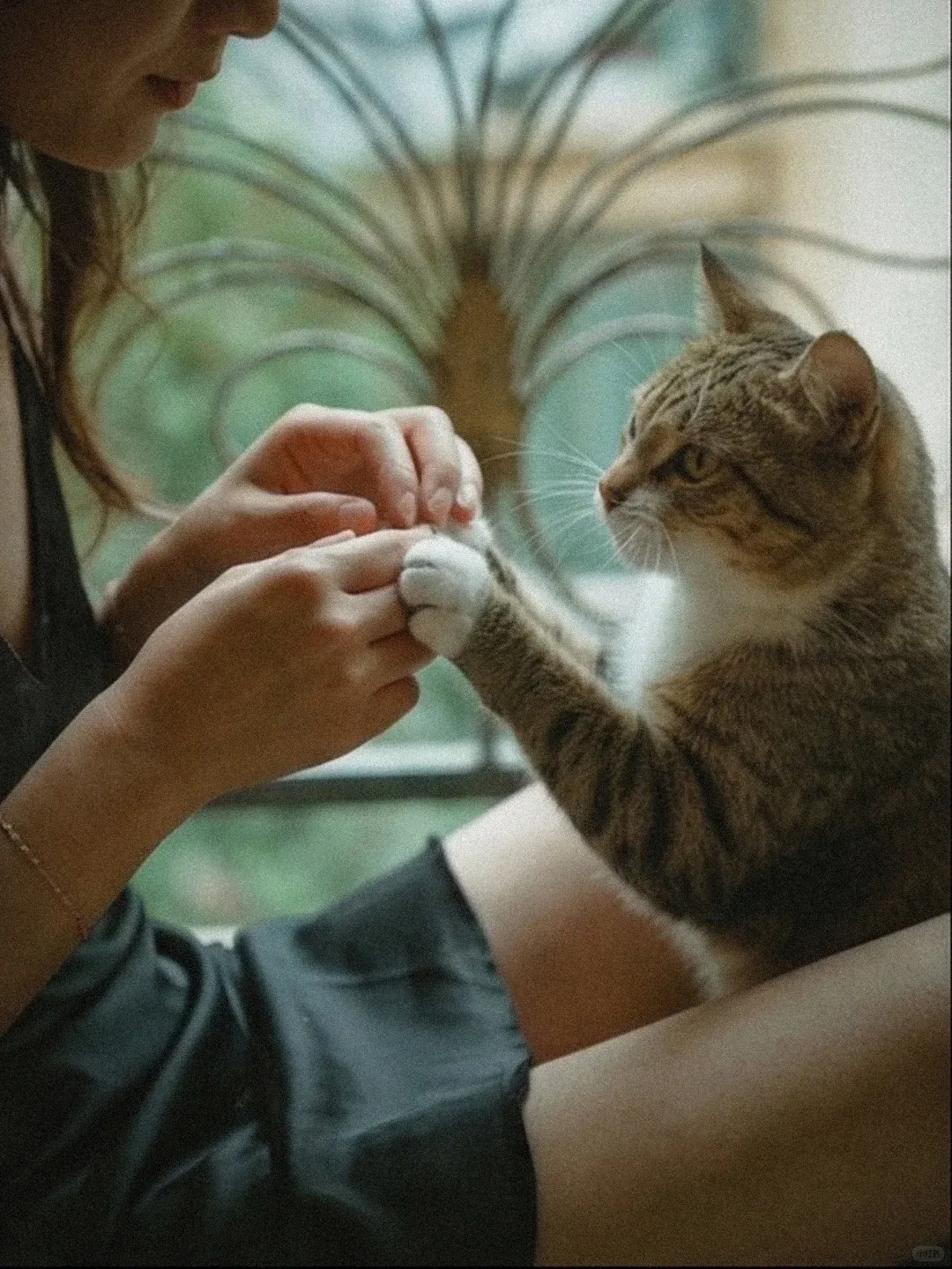 比如摸猫的脑袋、和猫咪对视、慵懒地靠在沙发上,让猫咪趴在身边,甚至可以让猫咪蹭你的手、你的脸颊,这些瞬间都特别有温度,拍出来的照片也更有生活气息,治愈又温柔。