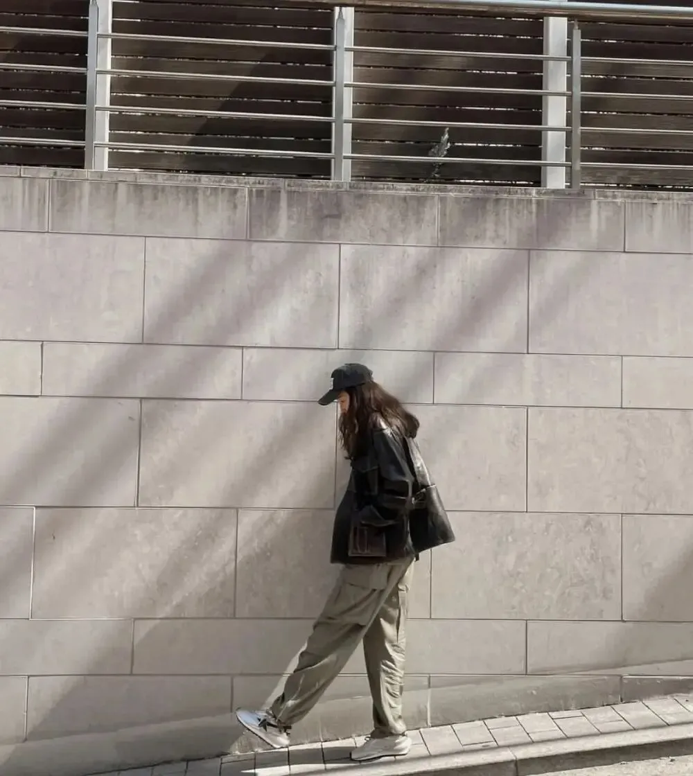 下面这套黑色皮夹克配土色工装裤特别好看。