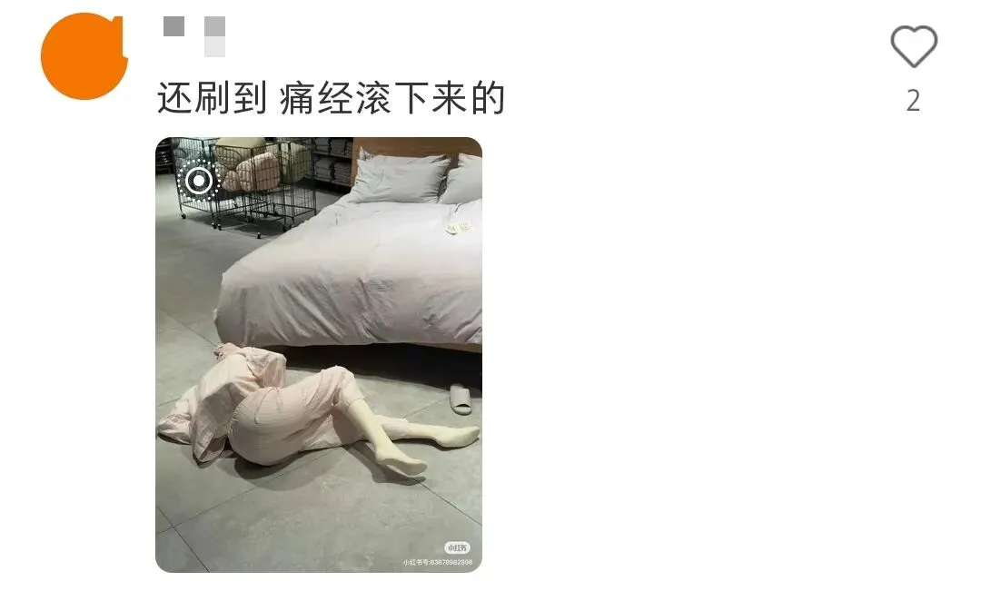 还有一位躺在地上手捂肚子的女模特,被网友封为“痛经滚下床の神还原”……