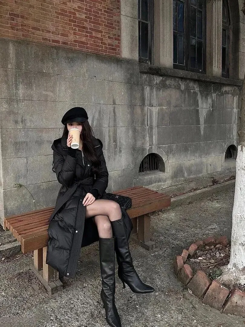 优雅路线也可以选择羽绒服。腰带系好,腰线凸显出来,再化个精致的妆容,红唇一点,气质立马拉满。贝雷帽和链条包在一起,人看起来就变得非常有风度。穿上高筒靴站在哪里都是画报中的女主。
