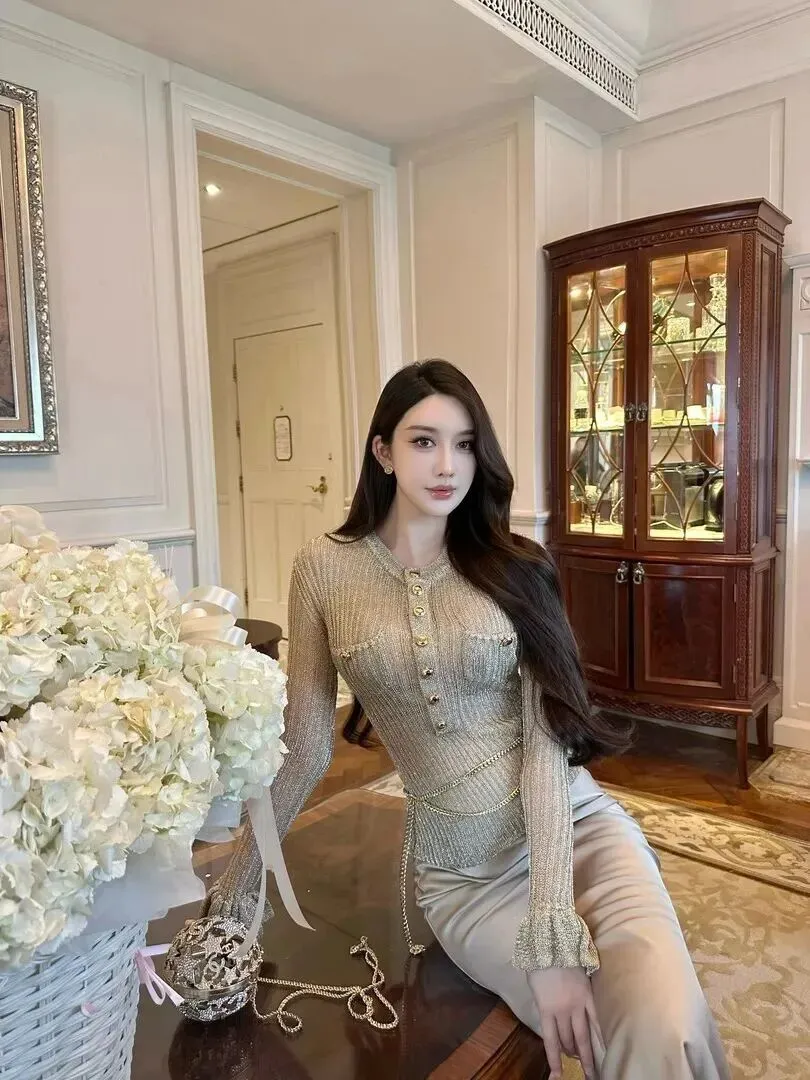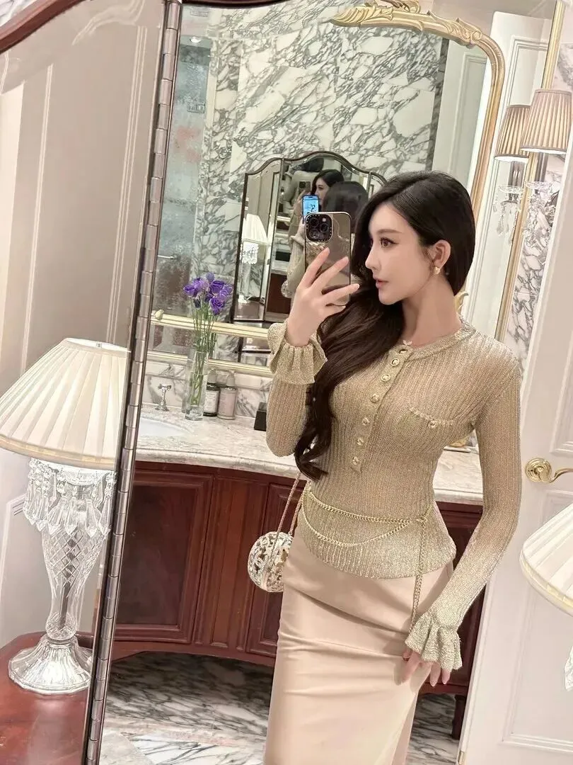 连奢华的浴室里也是这样的,香槟金针织上衣搭配浅米色半身裙,链条腰饰和球形手拿包一个组合出来,十分奢华。拍照打卡出片效果好,具有富贵、雅致之感。