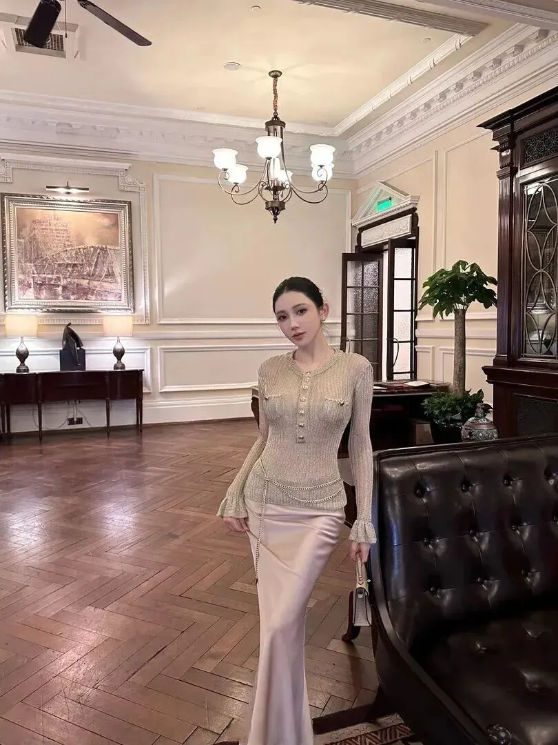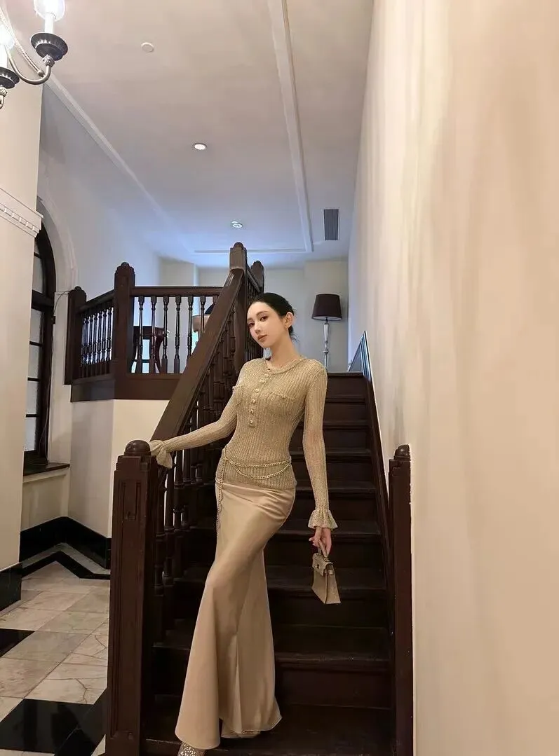 穿上这套衣服在不同的场景下效果是不一样的。身着浅金色针织上衣、香槟色缎面鱼尾裙、戴链式腰带来步入中世纪欧洲宫廷一样庄重端庄的华丽和高贵之中,却也带着奢华的特质。
