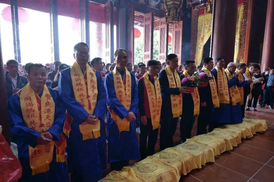 上午11时30分许,漳州龙海区榜山镇园仔头鲤州宫林允来、林以祥、林港福等率团抵达贤良港天后祖祠。祖祠董事会董事长林自弟、副董事长黄金象对进行进香团的到来表示热烈欢迎,并陪同进香团向妈祖行庄严的三献礼仪式。