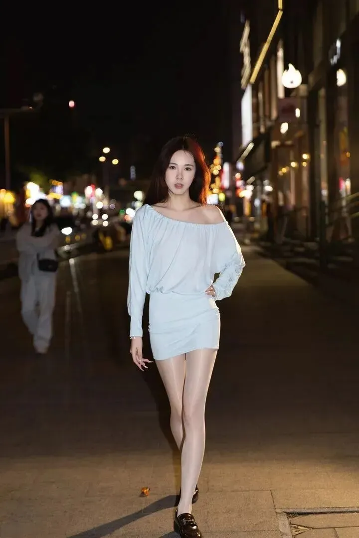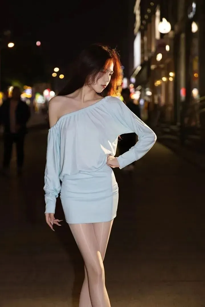 夜色中的蓝裙女神:她用最简单穿搭,美成了街头焦点!