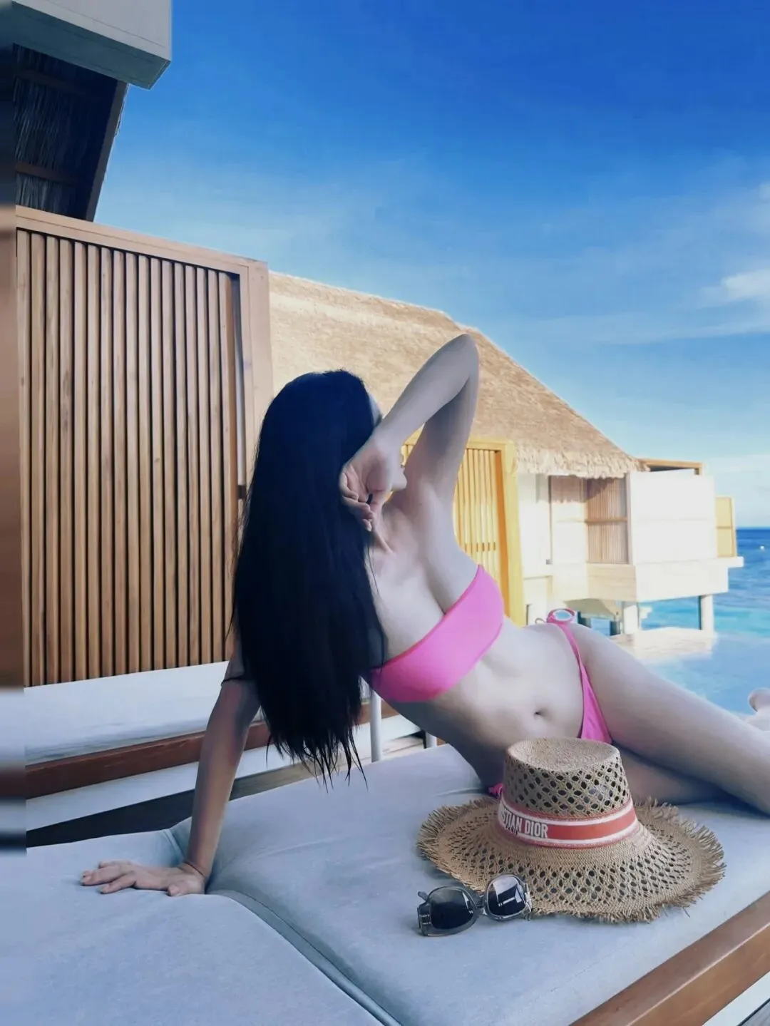 长发时而拂过肩头,时而贴在微湿的颈侧。墨镜没有遮住她的光芒,反而添了几分神秘——你看不清她完整的表情,却能感受到那份怡然自得的惬意。
