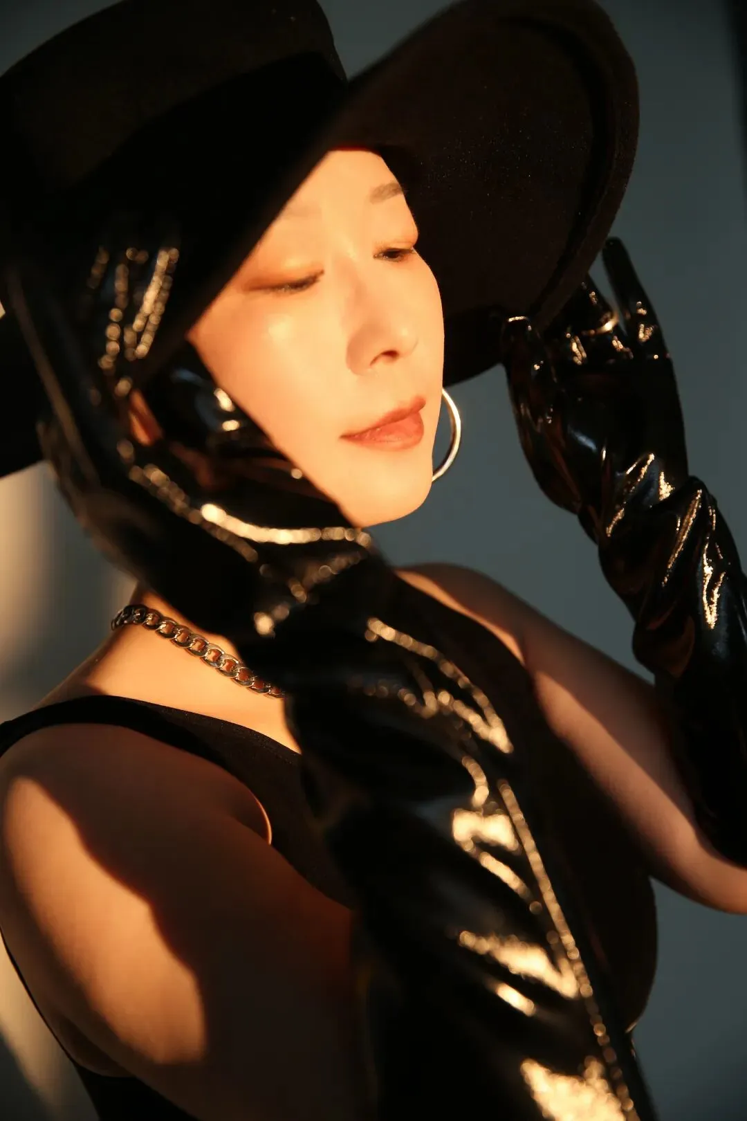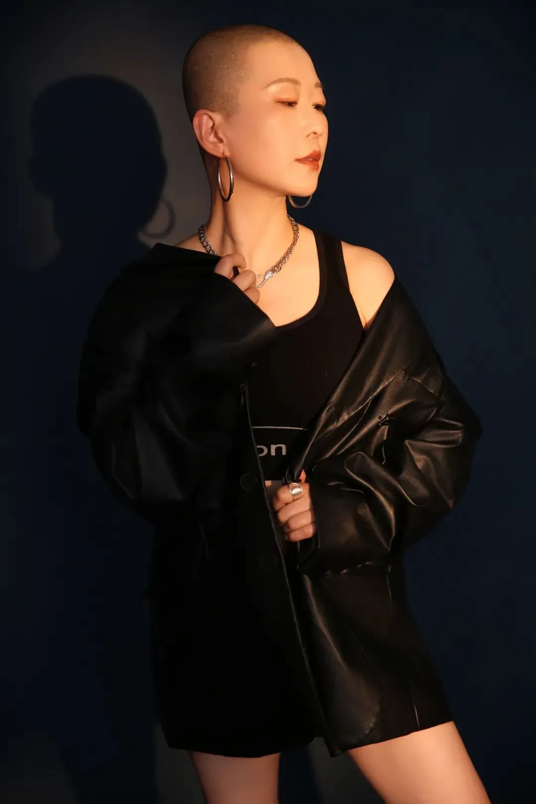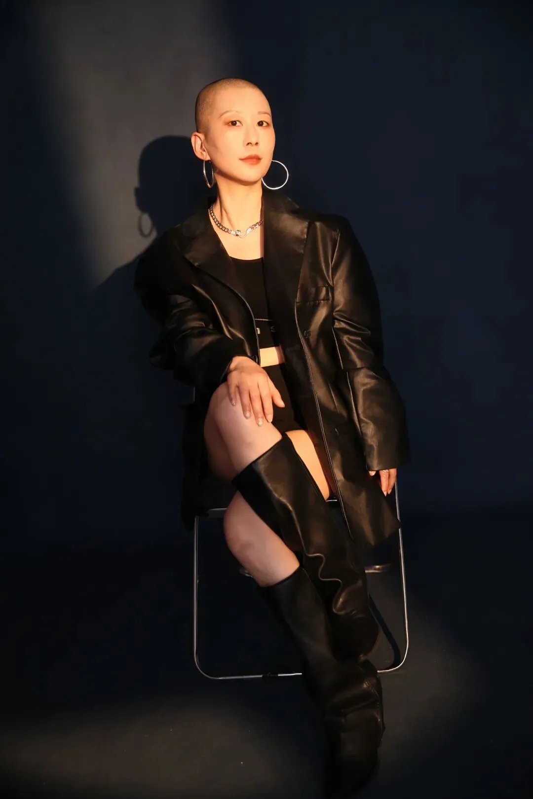当镜头对准我,没有长发披肩,没有温柔滤镜,只有光头、皮衣、长靴,和一双直视镜头、毫无怯懦的眼睛。