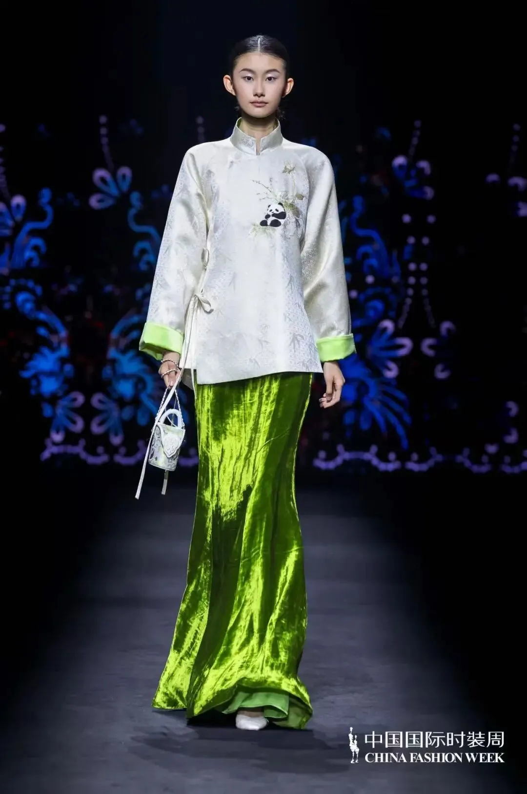 本季,曾凤飞(ZENG FENGFEI)以 “蜀锦” 为核心灵感,将古蜀大地的代表性文化符号转化为可穿戴的东方视觉语言。太阳神鸟的金色光辉,以抽象几何纹样跃然肩袖,寓意古蜀文明的璀璨永续;成都市花木芙蓉,以柔美花瓣解构重组,化作衣间层叠诗意;熊猫与翠竹的灵动意象,通过精致提花工艺织入面料,尽显蜀地生机;都江堰水纹凝为流动线条,萦绕裙裾,诉说天府之国的水利智慧;凤鸟纹、柿蒂纹取材汉代蜀锦经典,以现代构成手法焕新演绎;川剧脸谱的色块与线条被抽象提炼,化为局部点睛的色彩碰撞,