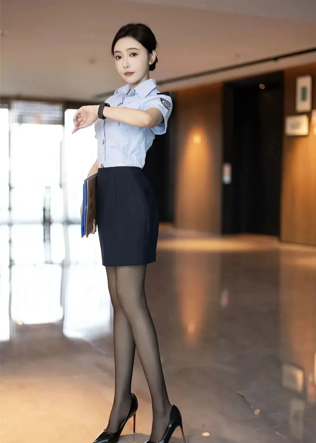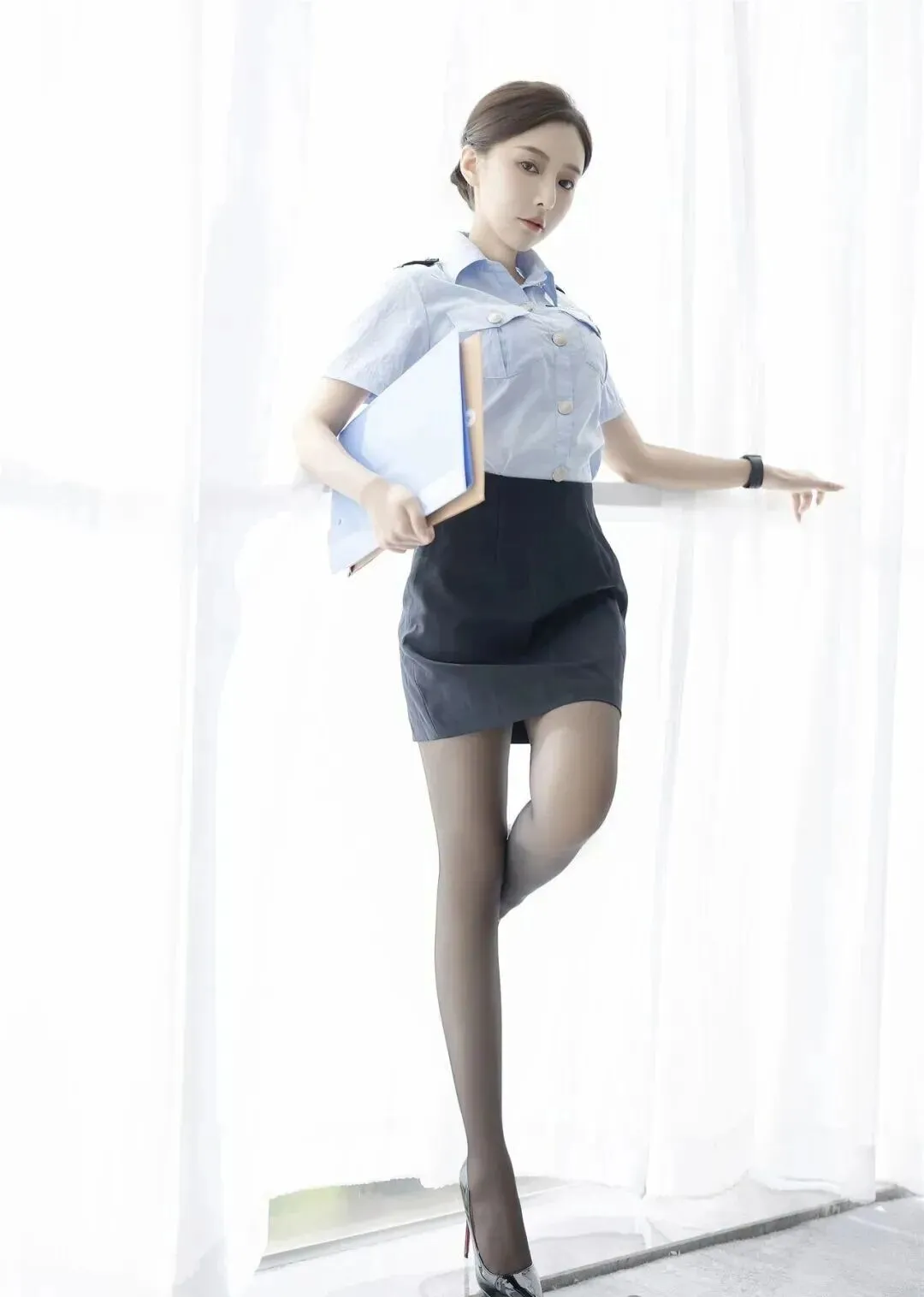 她的姿态更是优雅到骨子里,倚在窗边站立,整个人放松又不随意。左手抱着一个文件夹,文件夹整理得整整齐齐,看得出来是个细心又严谨的人,右手轻轻搭在窗边的栏杆上,动作轻柔,没有一点生硬感。最让人眼前一亮的是她的站姿,单腿点地,另一条腿微微弯曲,重心放在一条腿上,既不会显得僵硬,又能展现出优美的体态,一举一动都透着温柔与干练,没有多余的小动作,却自带气场。