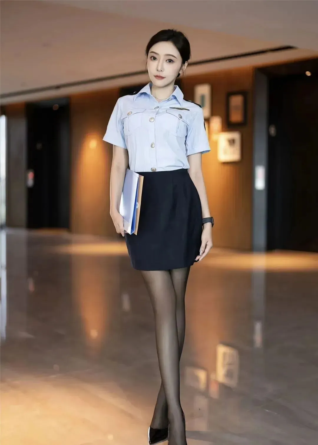 穿搭更是亮点满满,堪称职场穿搭的典范!上身是一件浅蓝色的短袖制服衬衫,颜色温柔又清爽,不是那种死板的深蓝色,浅色系更显气质,也更有亲和力。衬衫的版型很合身,不宽松也不紧身,刚好能勾勒出纤细的腰身,领口平整,纽扣系得整齐,没有一丝随意,细节感拉满。袖口长度刚好到小臂,露出纤细的手腕,显得格外利落。