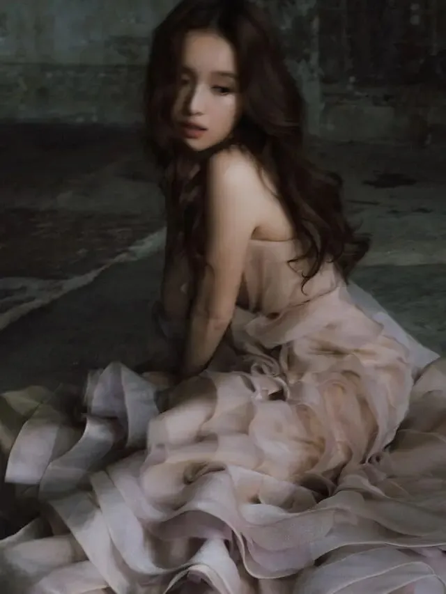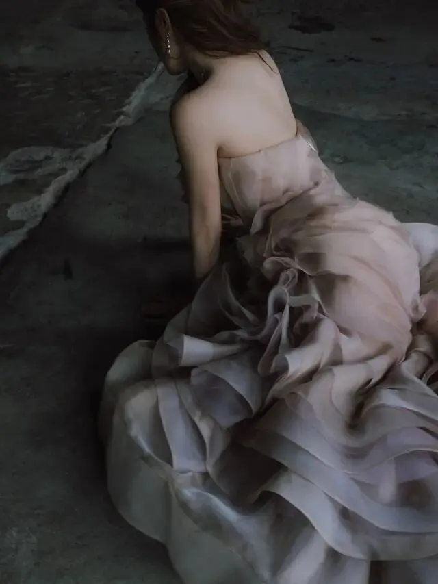 鄺潔楹身穿裸粉色抹胸荷葉邊長裙。(ig@judy.kwong)
