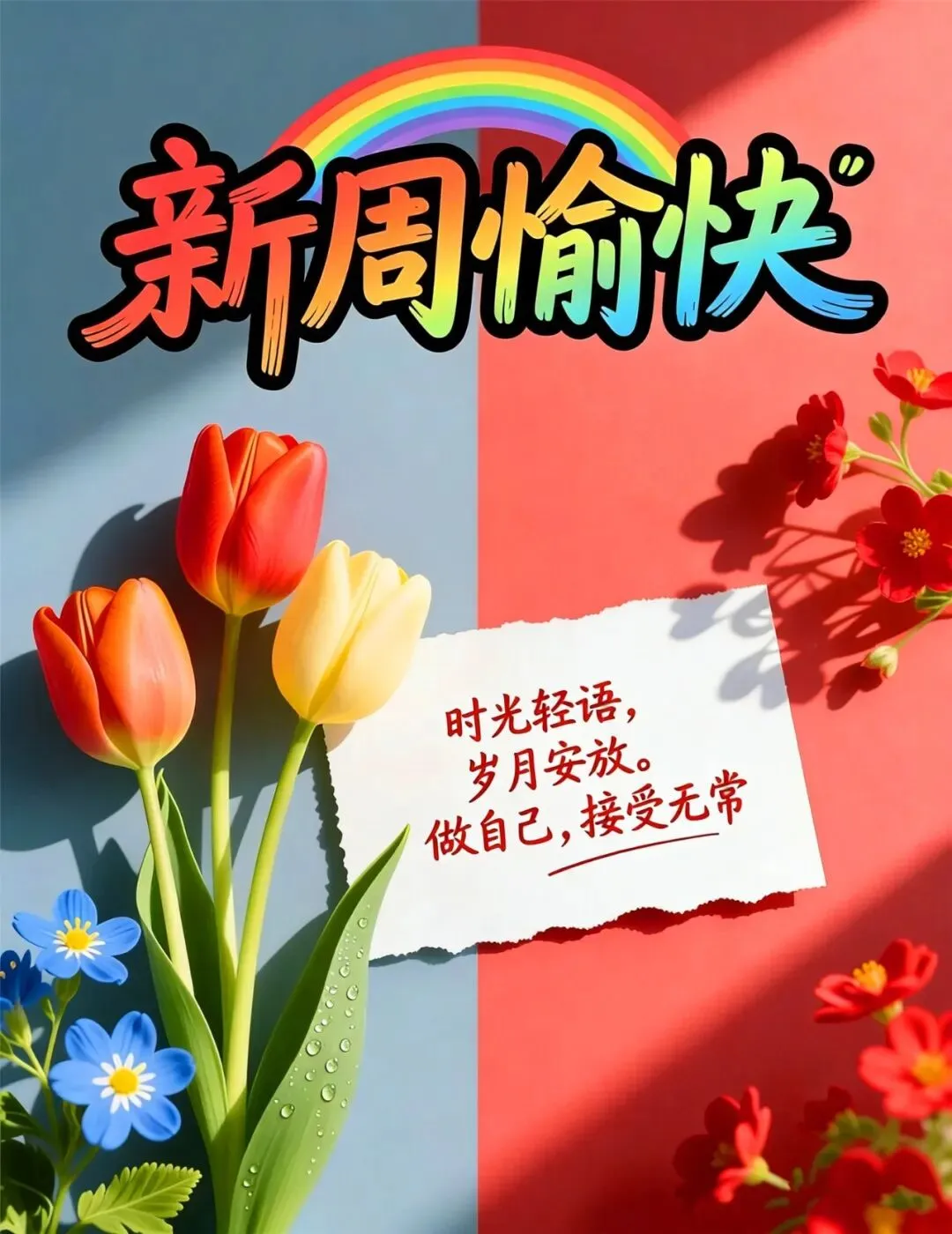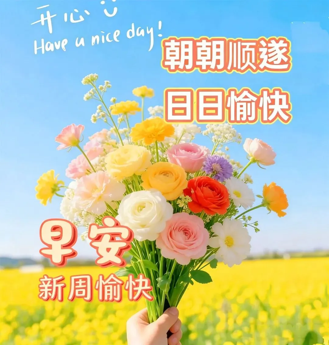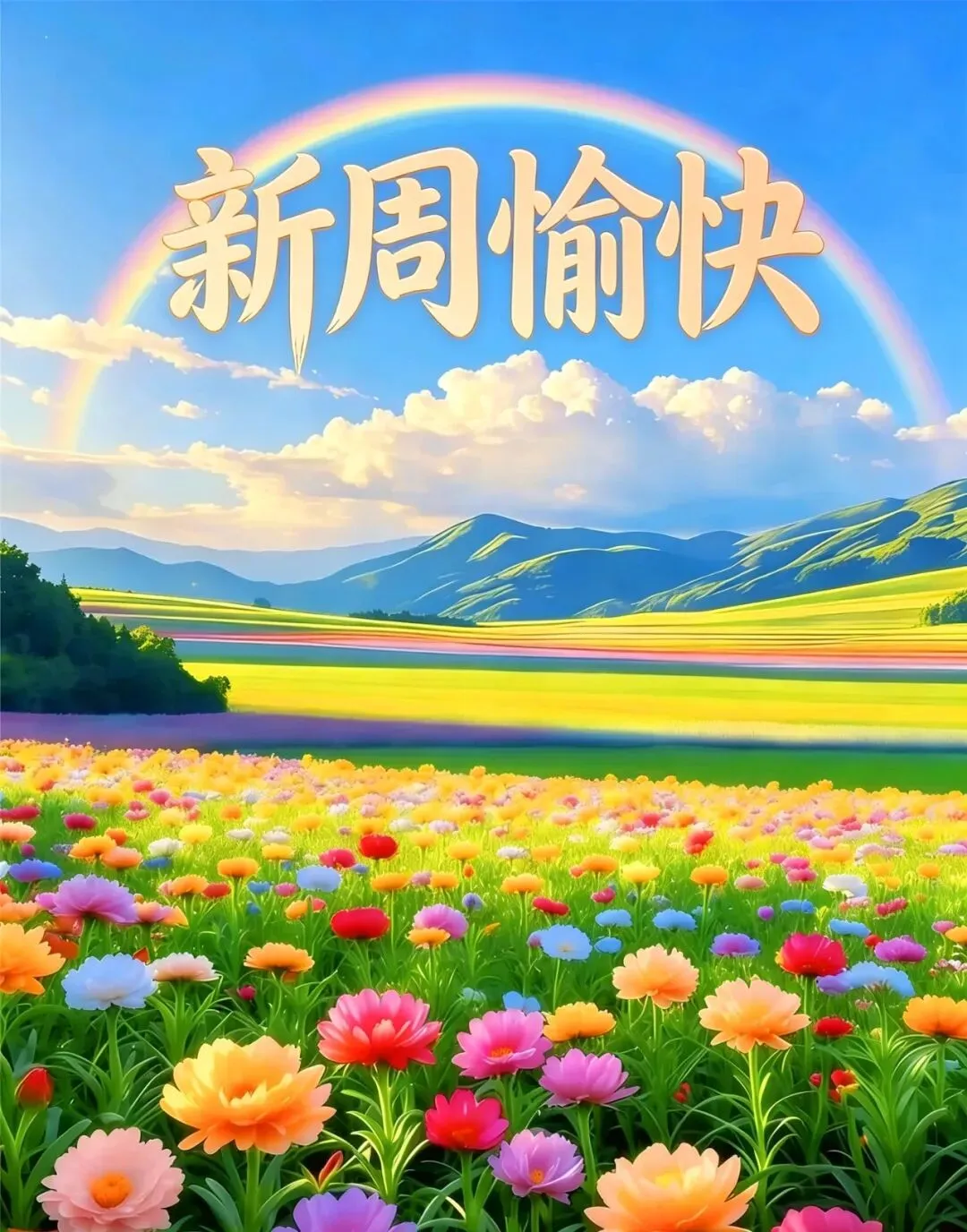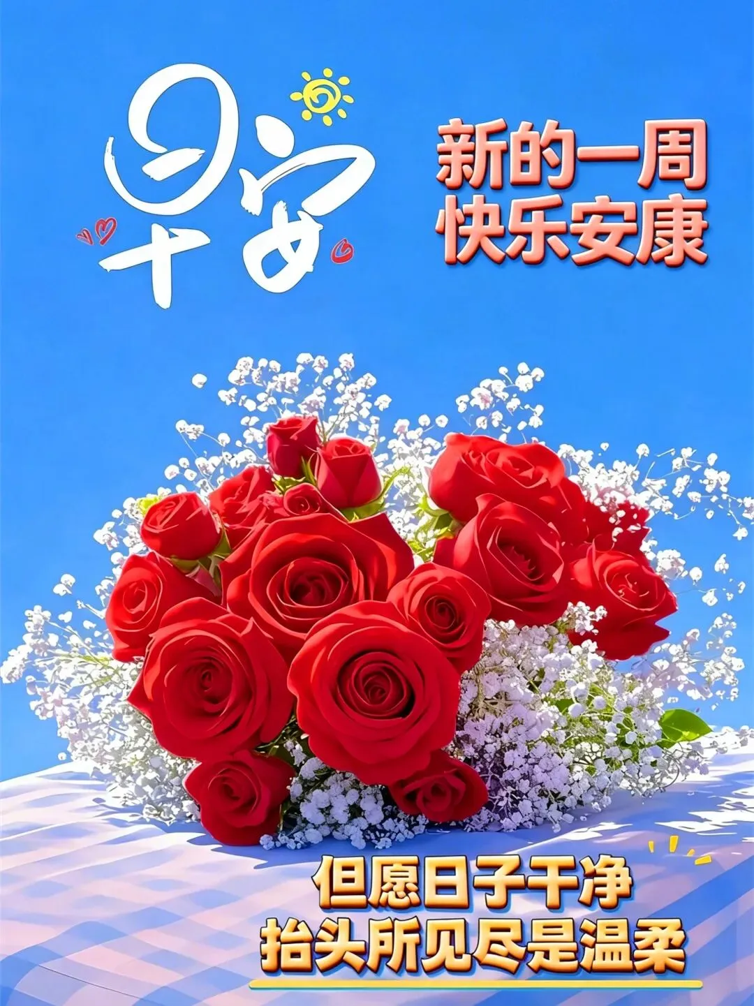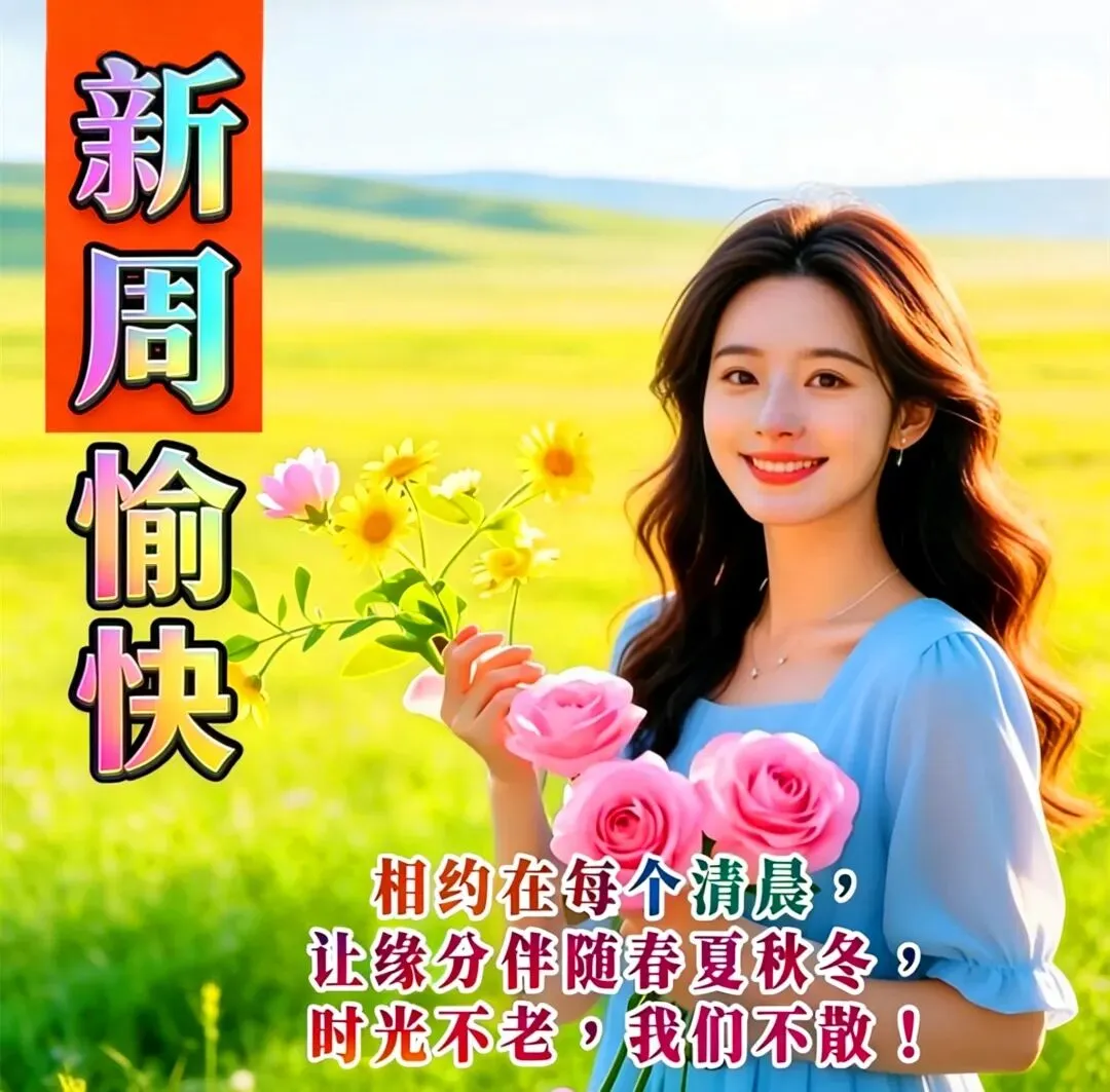 新的一周,祝你烦恼全清零,快乐全满格,平安常相伴,健康永相守,工作不疲惫,生活有滋味,事事都顺心,天天都开心。愿所有美好都如期而至,所有幸运都不期而遇!