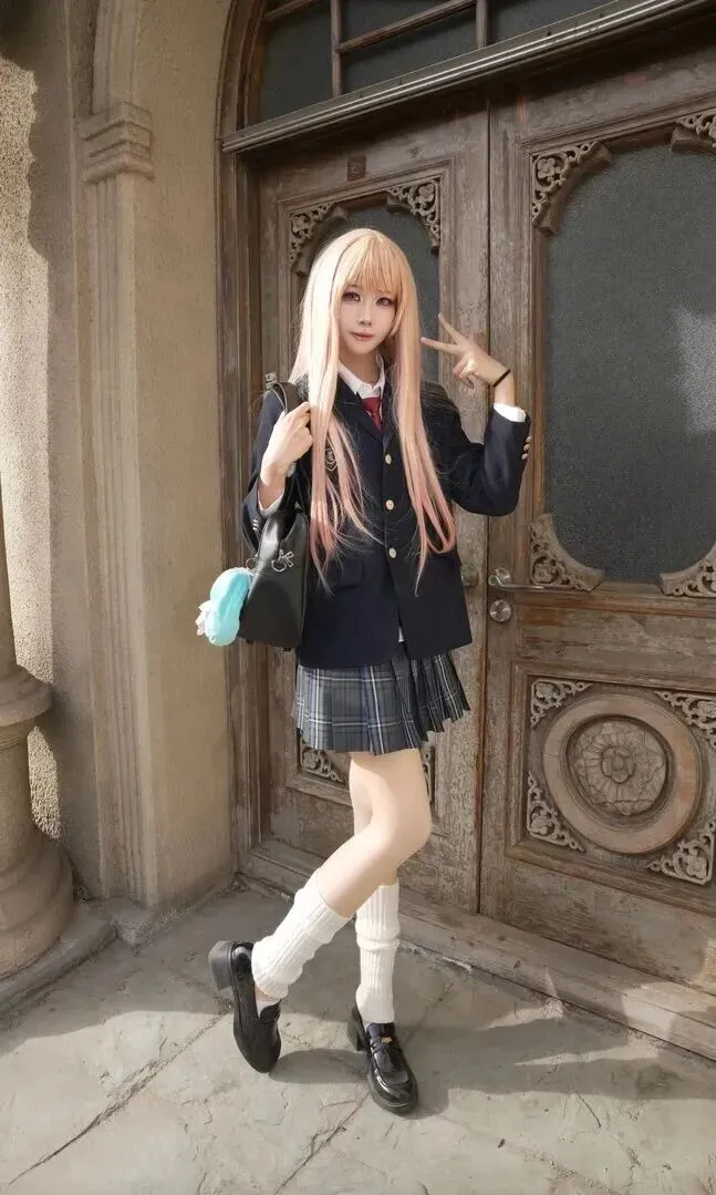 先看第一套,基础款也能穿出不一样的味道。用藏蓝色西装外套加经典格纹百褶裙的形式在简朴大方之中保留着品位。米白色堆堆袜是小心机,能让人腿看起来更细长、更直。头发是浅金色的,带有淡淡的粉橘色的渐变,齐刘海很减龄。整体上具有温柔又带有一点调皮的特点,无论是上课还是约会,都能够游刃有余地掌控好自己的情绪和举止,就像电视剧里女主人公那样。