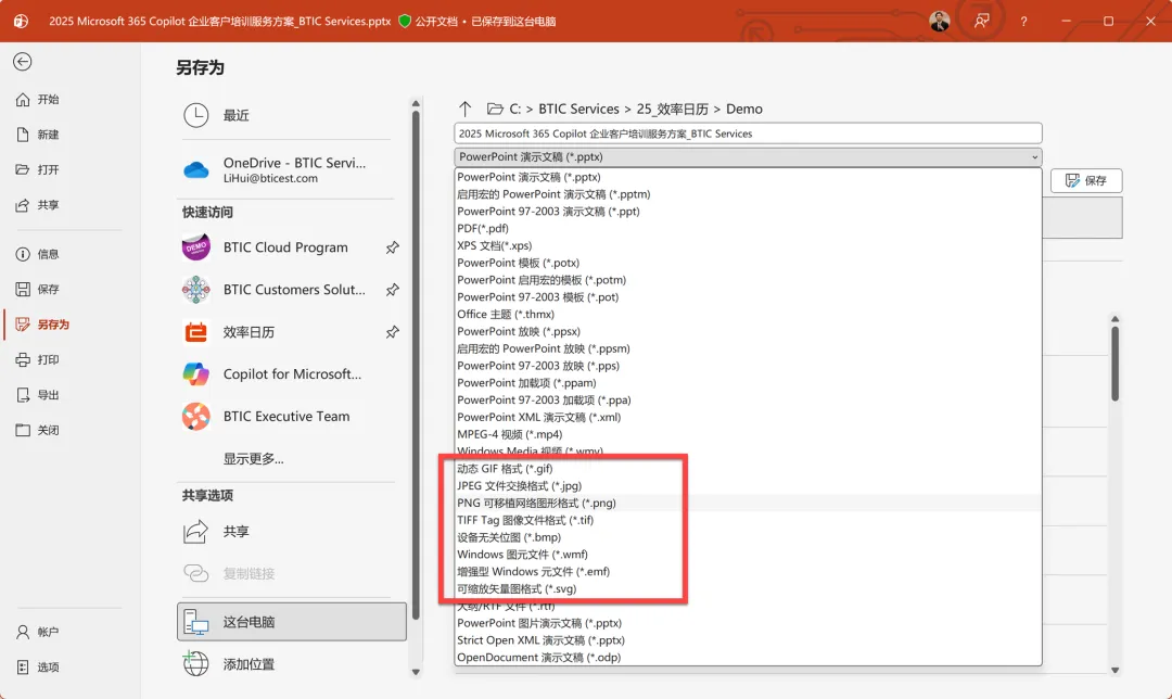 打开这个需要处理的 PowerPoint 演示文档,然后在“文件”后台视图中另存为命令。在“保存文件类型”下拉列表中,我们选择将其另存为图片文件,其中包括 JPG、PNG、BMP 等不同图片格式,具体选择哪一种图片类型,根据你自己的需求,以及图片应用场景而定。