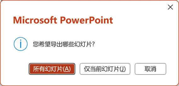 完成后,单保存按钮,在随即弹出的提示对话框中,询问是要导出该演示文档的所有幻灯片呢,还是只导出当前幻灯片